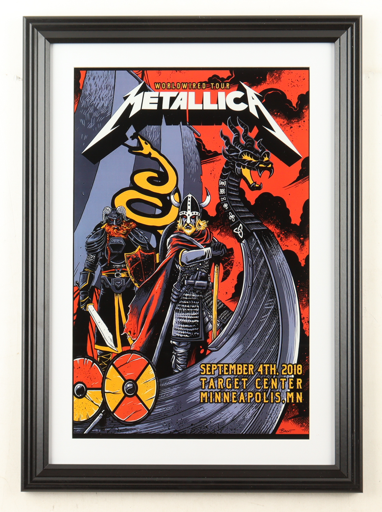 Custom frame measures approximately 15" x 21" in size and features a 2018 "Metallica: Worldwired Tour" Minneapolis Concert Poster. Please note, the display is unsigned and there is minor scuffing throughout the frame.
