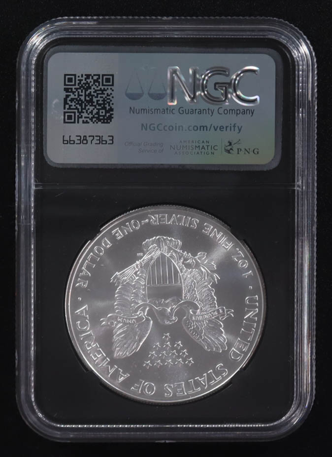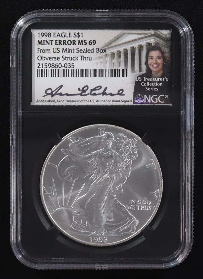 Mint Error 1998 American Silver Eagle $1 Coin Obverse Struck Thru Black Core Holder - Anna Escobedo Cabral Signed Label (NGC MS69)