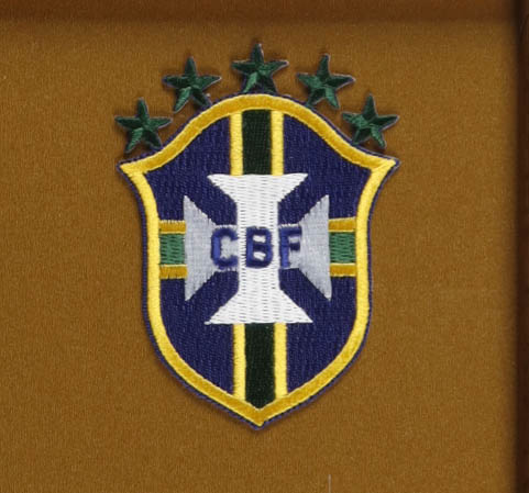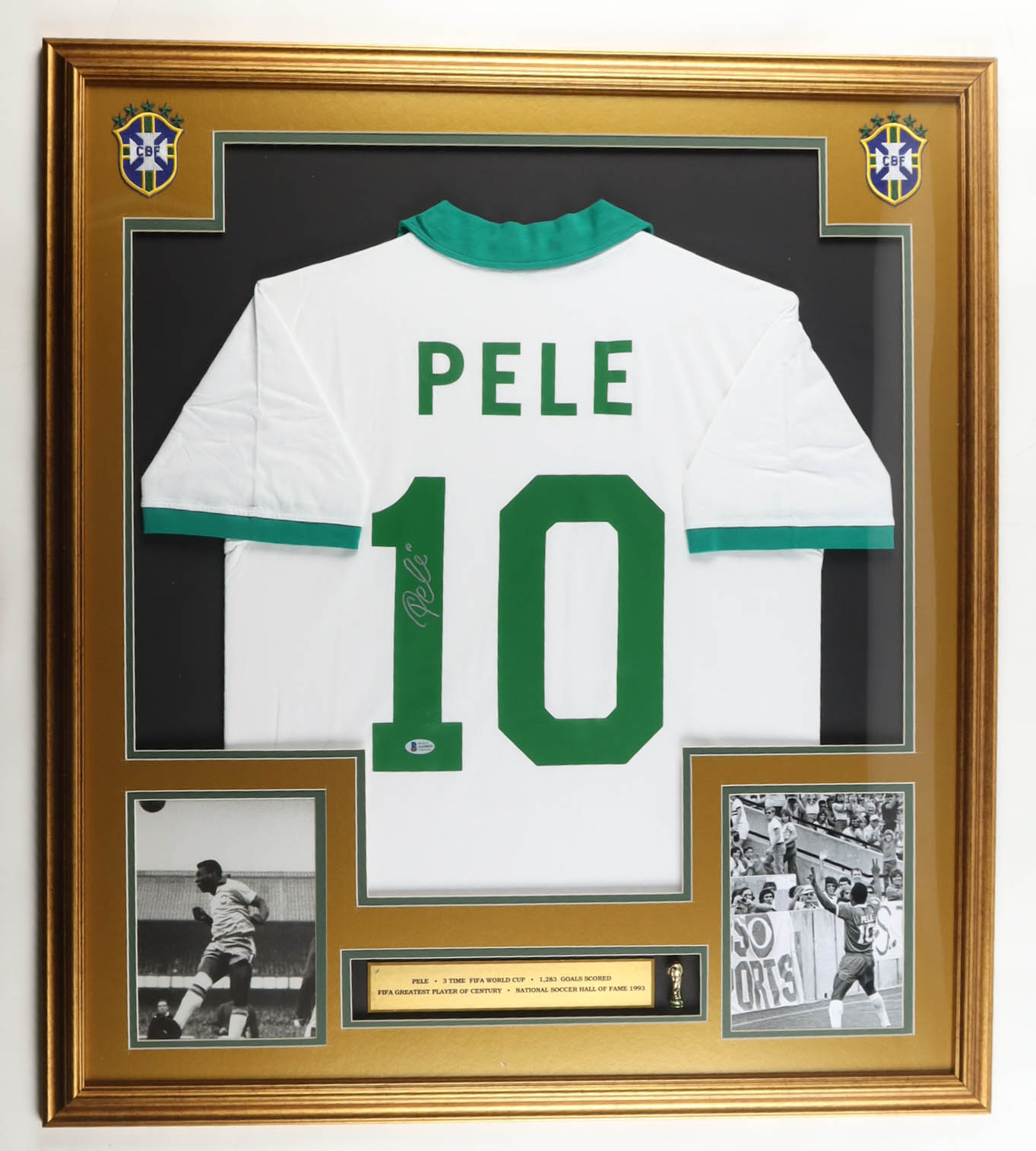 Pele Signed Custom Framed Jersey Display With (2) Cosmos Team Logo Patches & Mini World Cup Trophy (Beckett)
