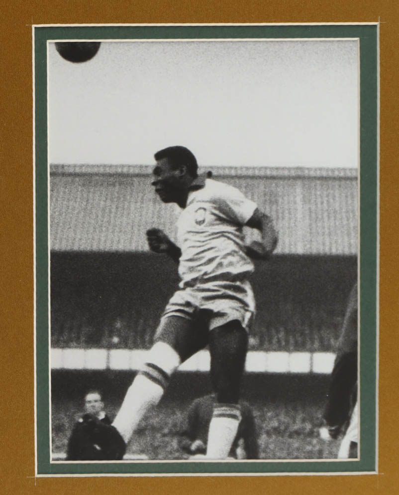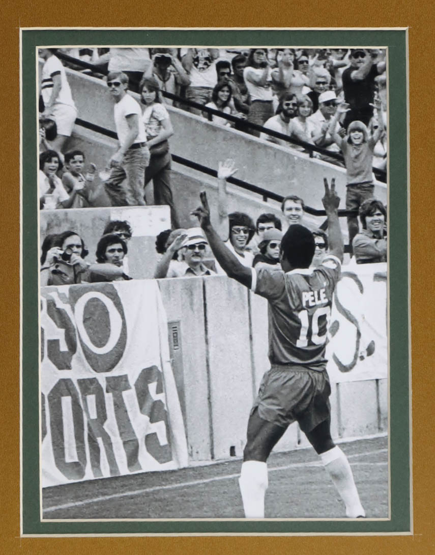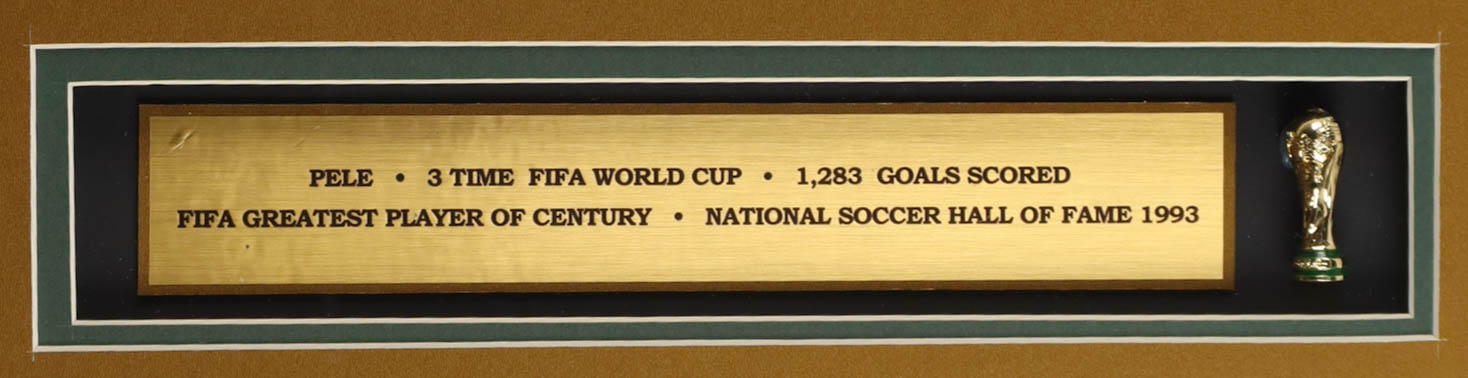 Custom frame measures approximately 32.5" x 36.5" in size and features a jersey that has been hand-signed by Pele (D. 2022). The display also includes a mini World Cup Trophy, (2) photos and (2) New York Cosmos Cloth Logo Patches.