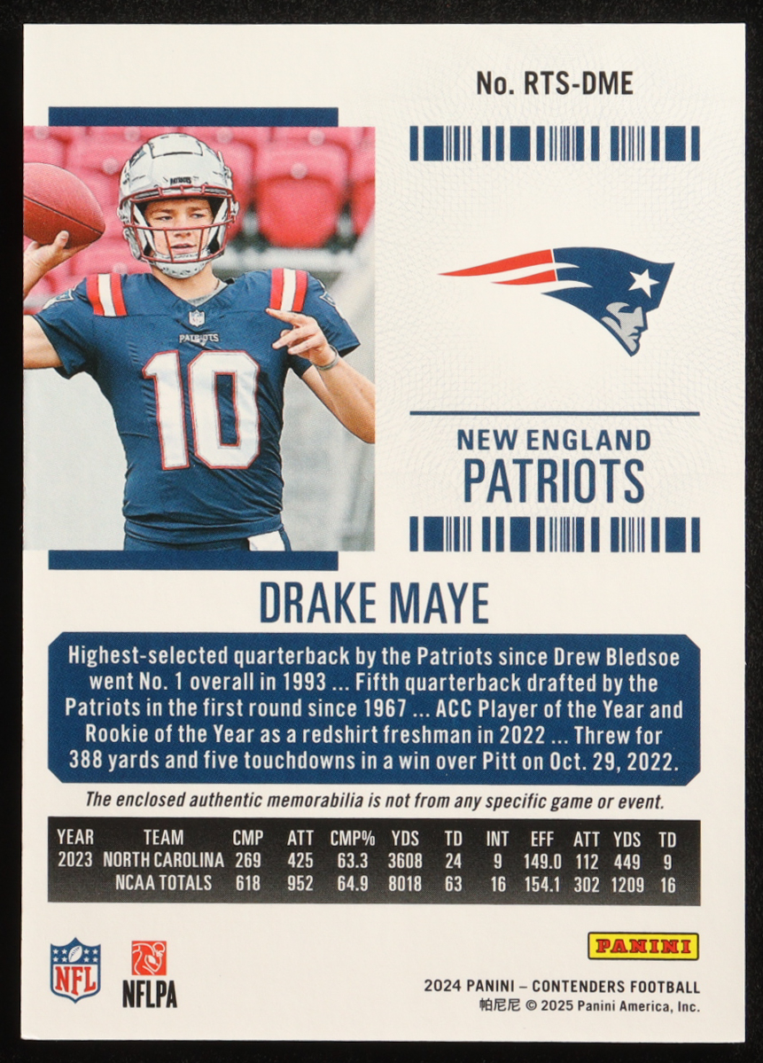 Drake Maye 2024 Panini Contenders Rookie Ticket Swatches #11 RC