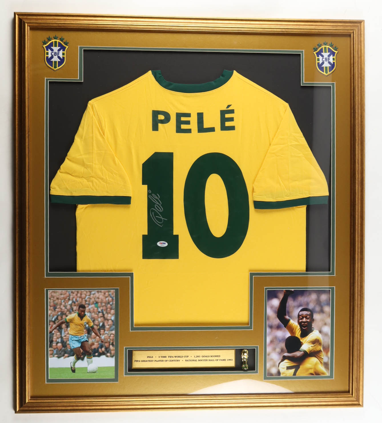 Pele Signed Custom Framed Jersey Display With (2) Team Logo Patches & Mini World Cup Trophy (PSA)