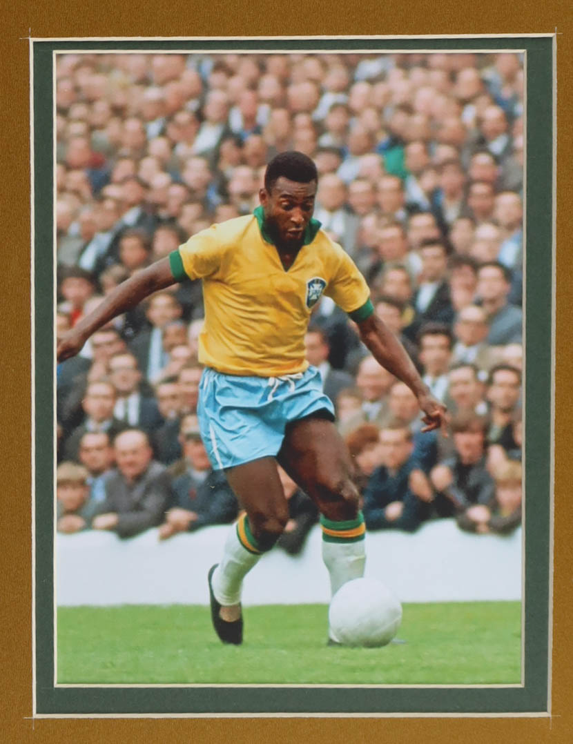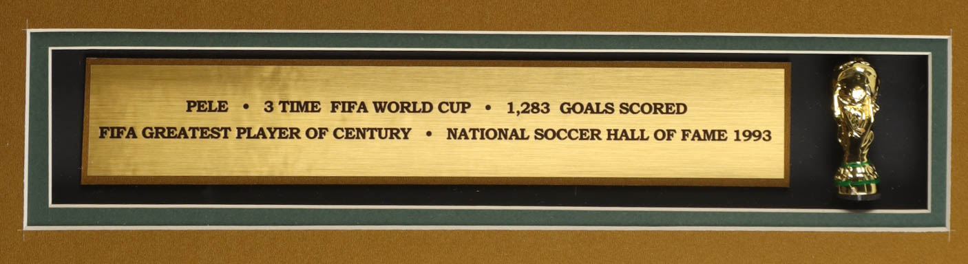 Custom frame measures approximately 32.5" x 36.5" in size and features a jersey that has been hand-signed by Pele (D. 2022). The display also includes a mini World Cup Trophy, (2) photos and (2) Team Cloth Logo Patches.