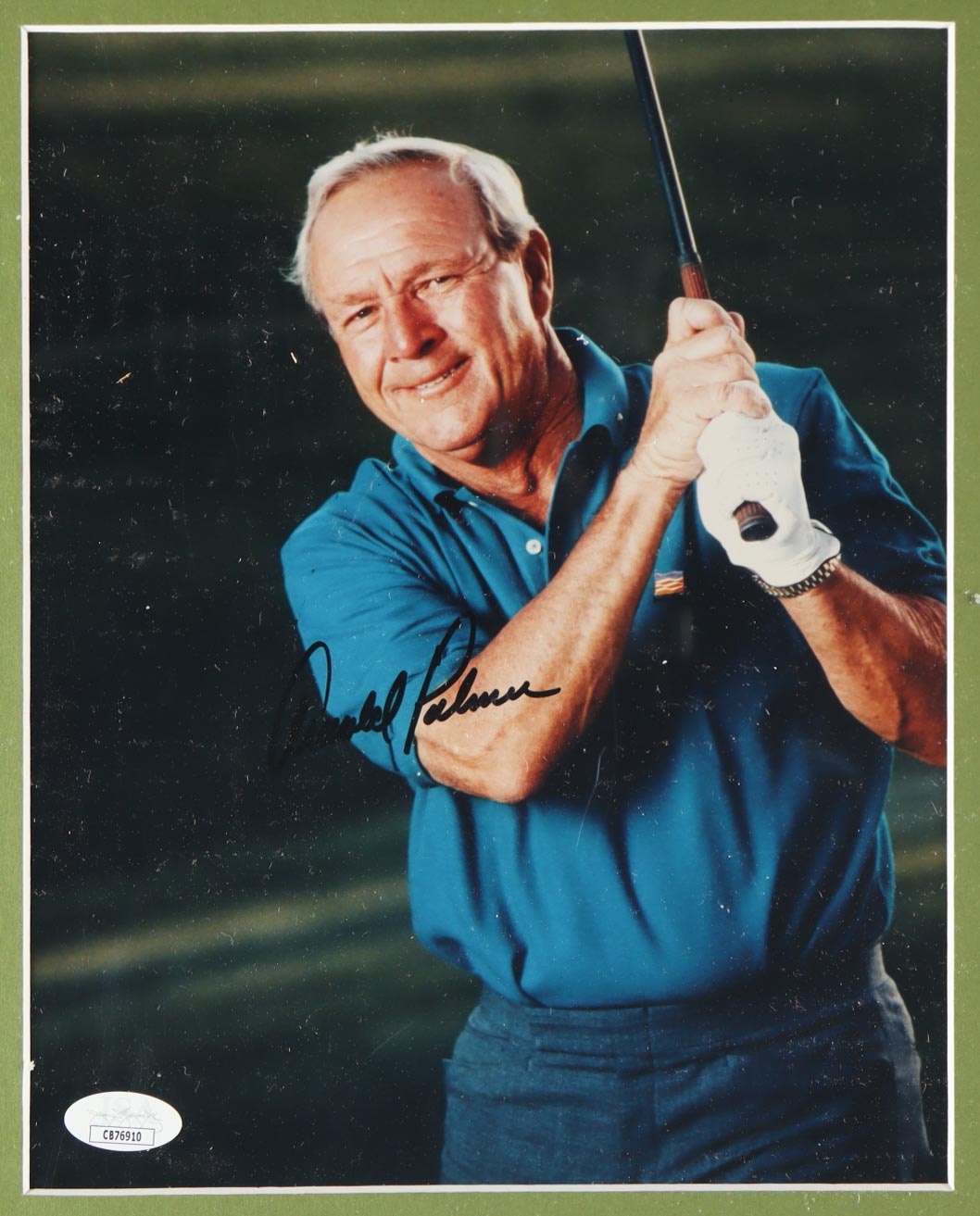 Custom frame measures approximately 12" x 18" in size. 8" x 10" photograph has been hand-signed by Arnold Palmer (d. 2016, HOF). Please note, the bottom right corner of the photo frame is cracked.