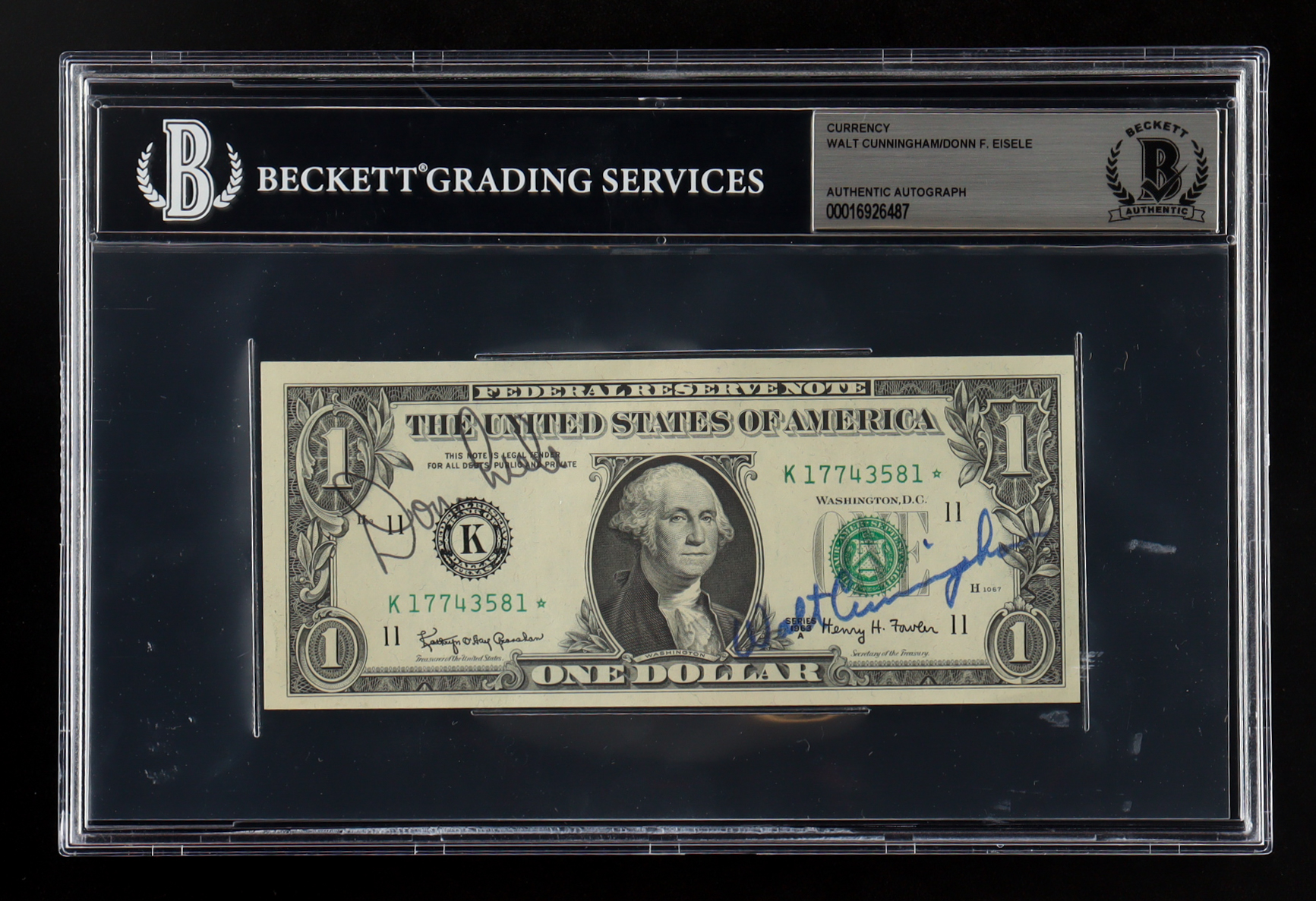 Walter Cunningham & Donn F. Eisele Signed 1963-A United States $1 One Dollar Federal Reserve - "Star Note" (BGS)