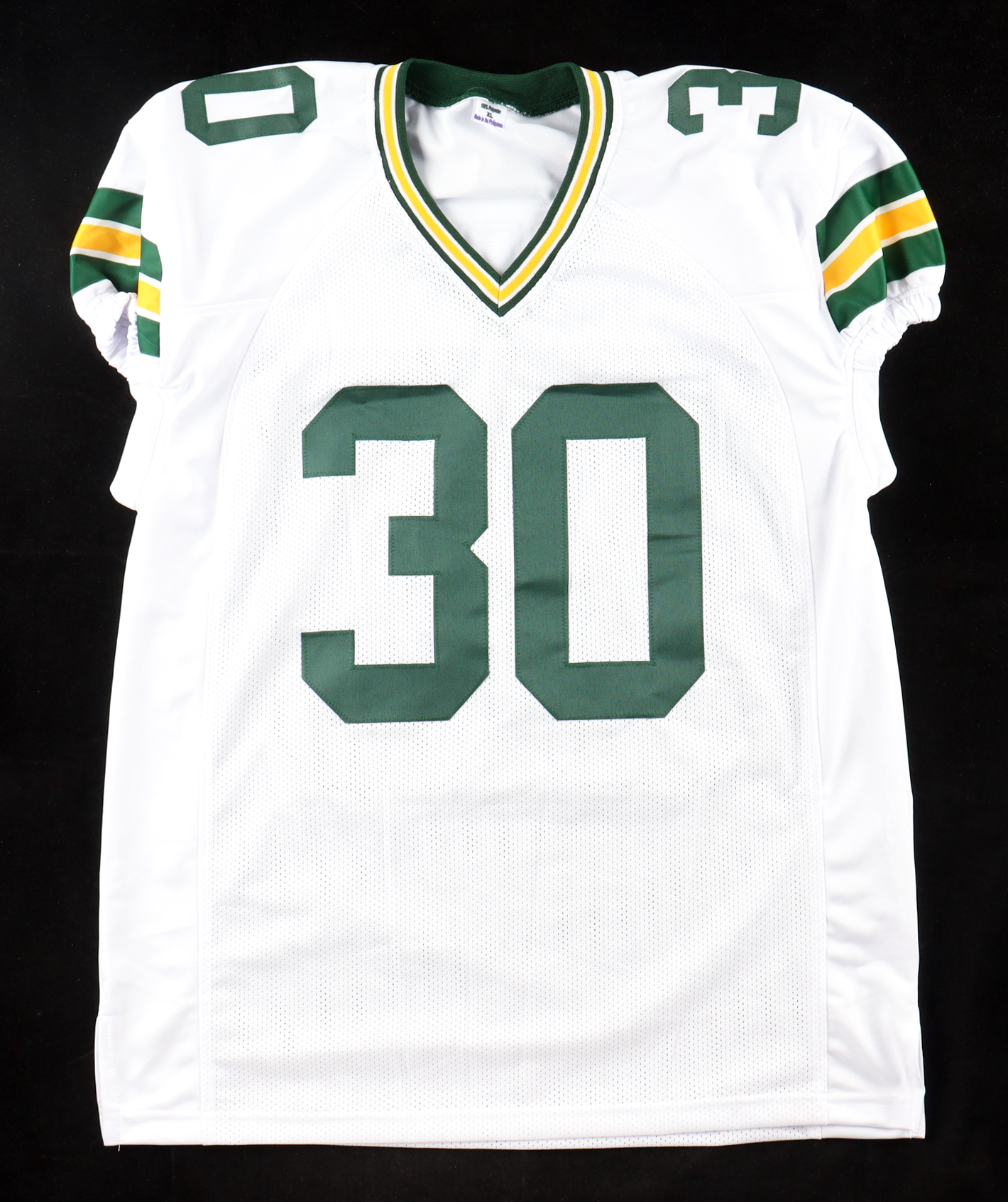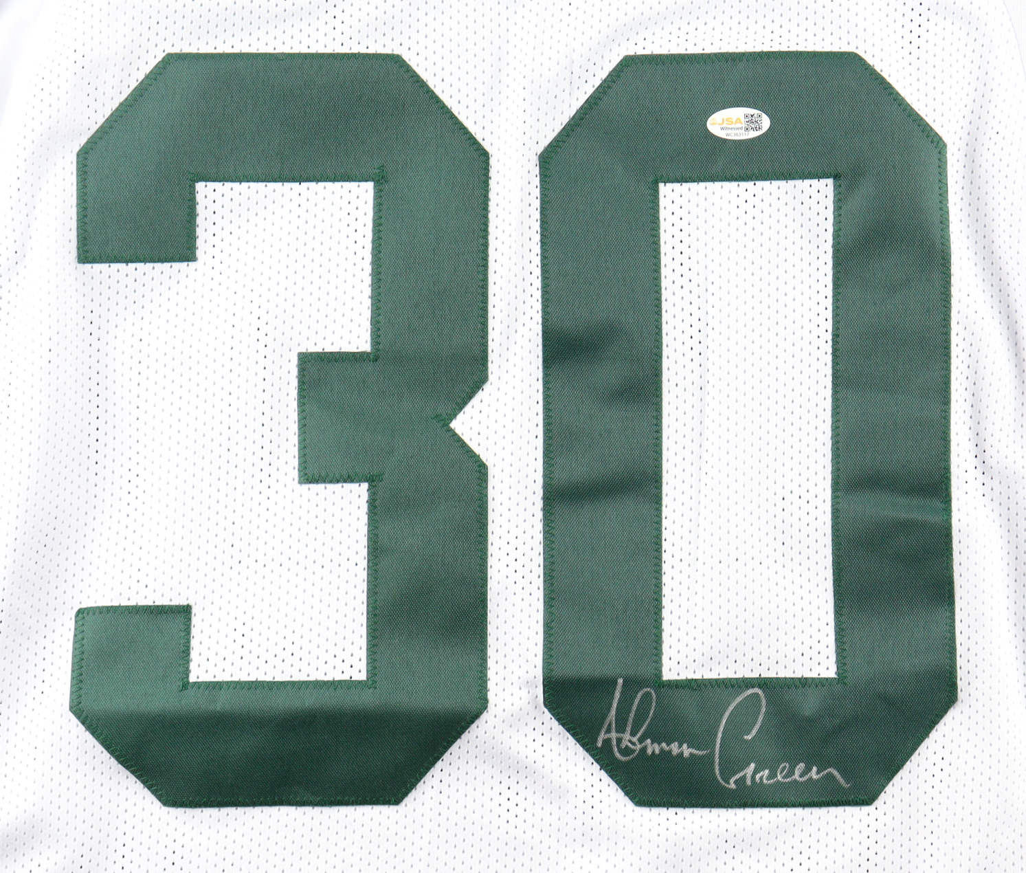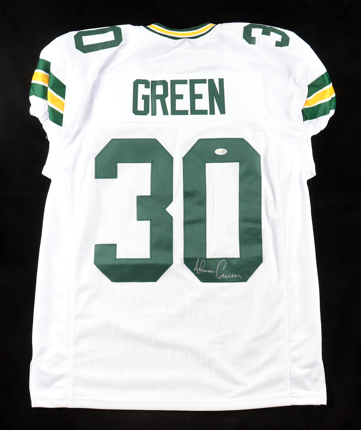 Custom jersey with everything sewn on, size XL. Hand-signed by Ahman Green.