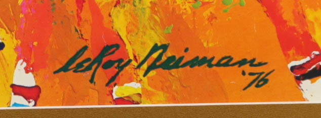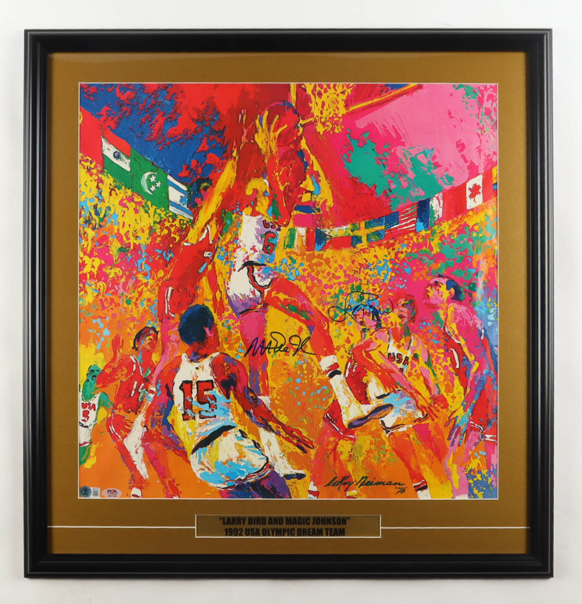 Custom frame measures 26" x 27" in size and features an art print that has been hand-signed by Magic Johnson (Los Angeles Lakers, HOF) and Larry Bird (Boston Celtics, HOF) as well by the artist LeRoy Neiman (D. 2012).