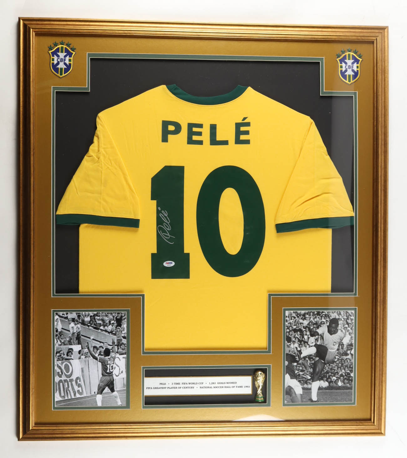Pele Signed Custom Framed Jersey Display With (2) Team Logo Patches & Mini World Cup Trophy (PSA)