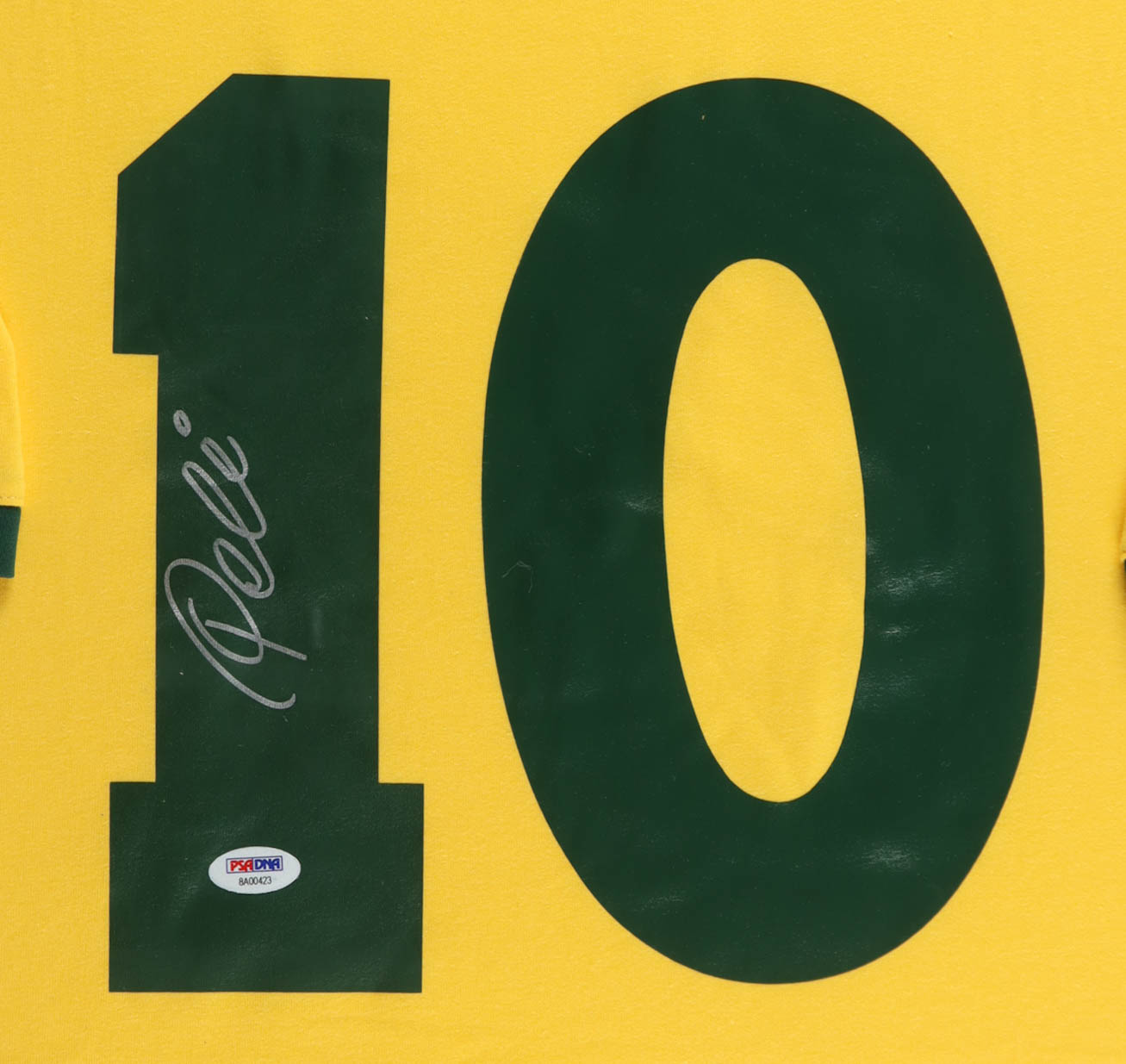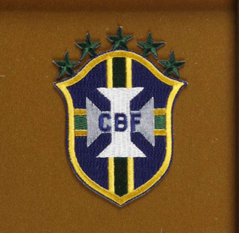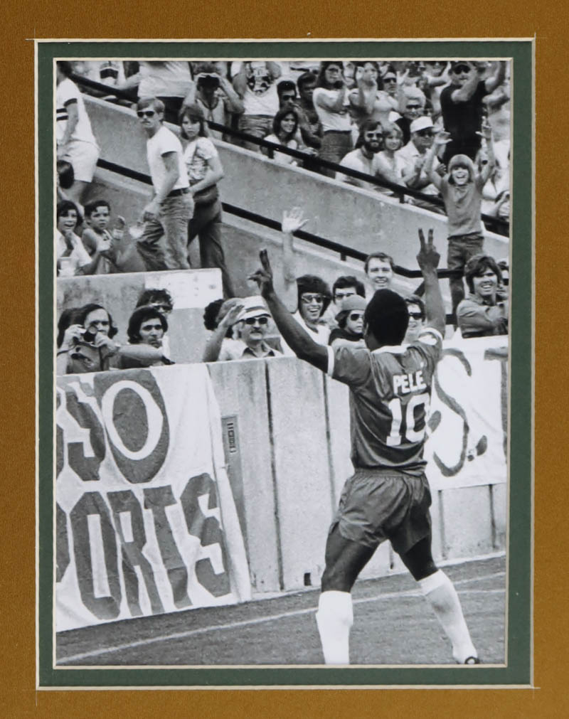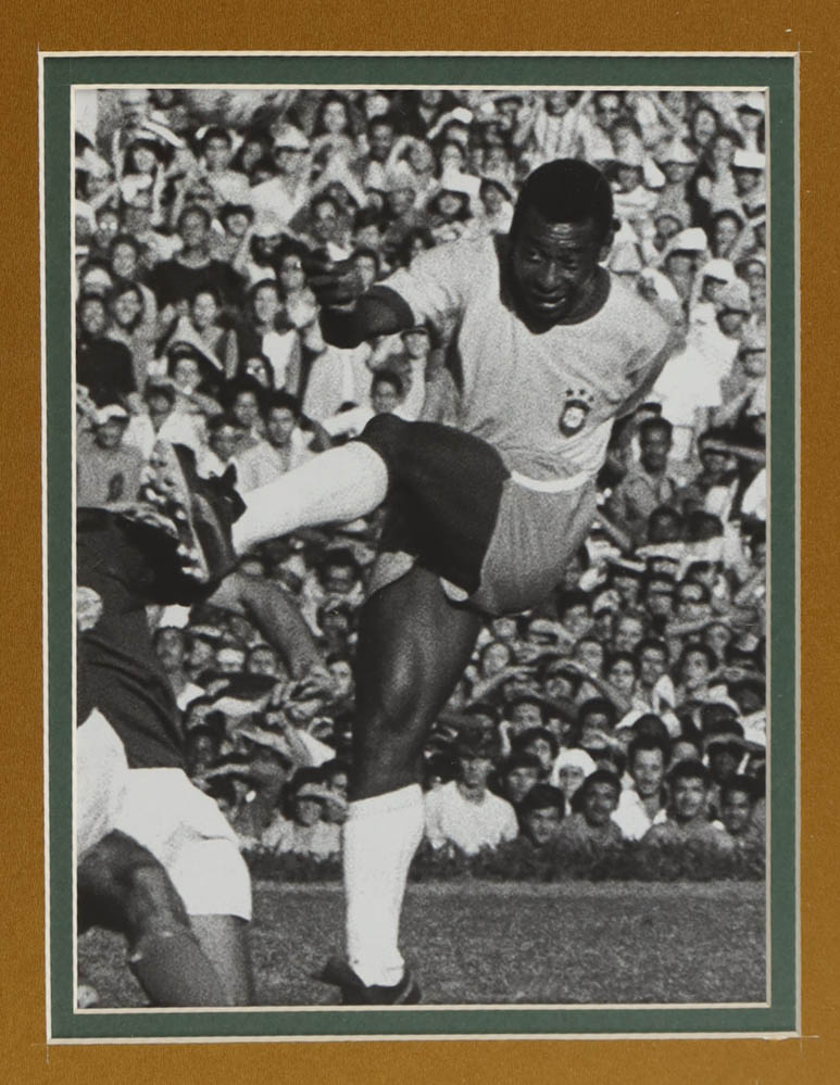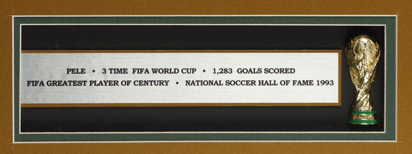 Custom frame measures approximately 32.5" x 36.5" in size and features a jersey that has been hand-signed by Pele (D. 2022). The display also includes a mini World Cup Trophy, (2) photos and (2) Team Cloth Logo Patches.