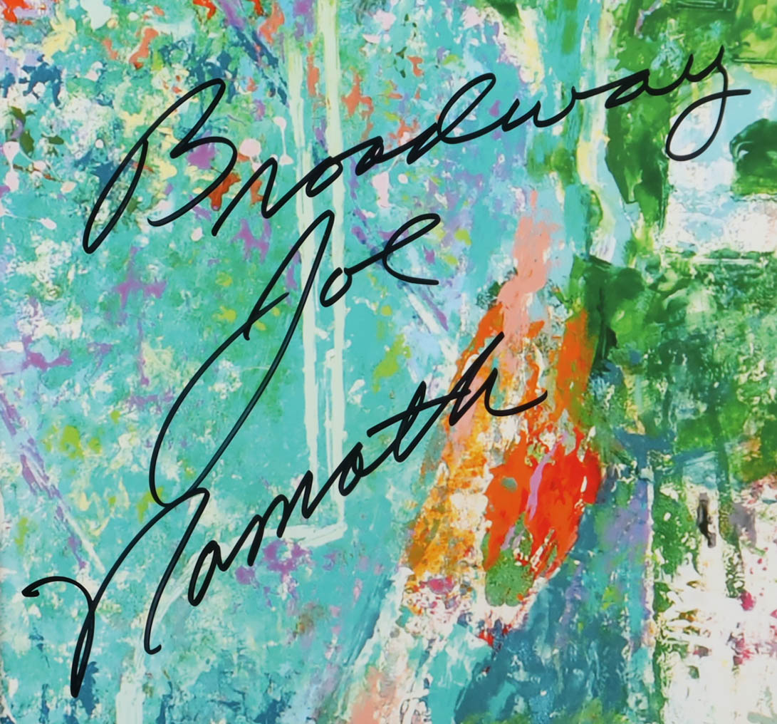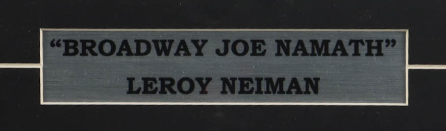 Custom frame measures approximately 26" x 33" in size and features an art print that has been hand-signed and inscribed by Joe Namath (New York Jets, HOF) and by the artist Leroy Neiman (D. 2012).