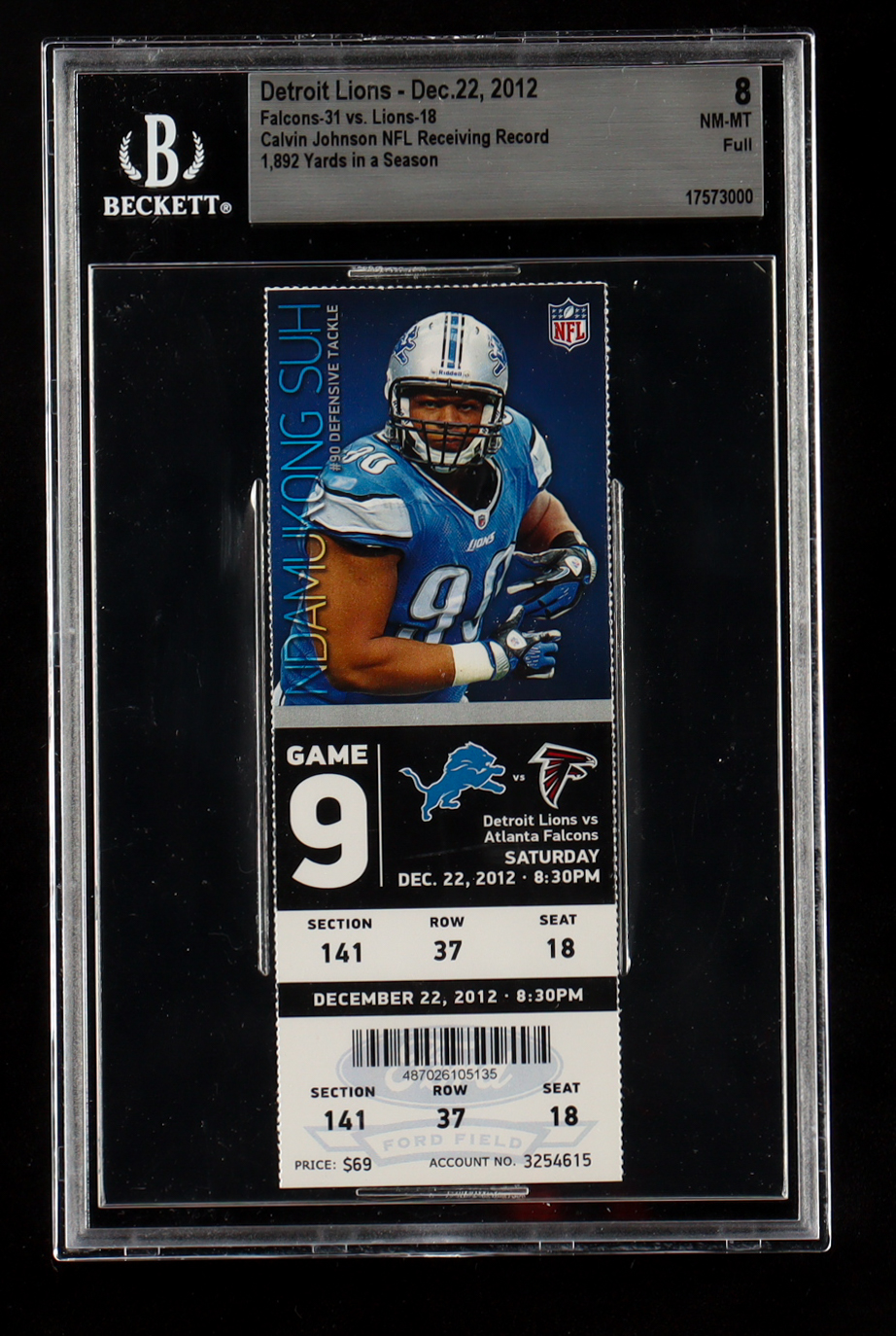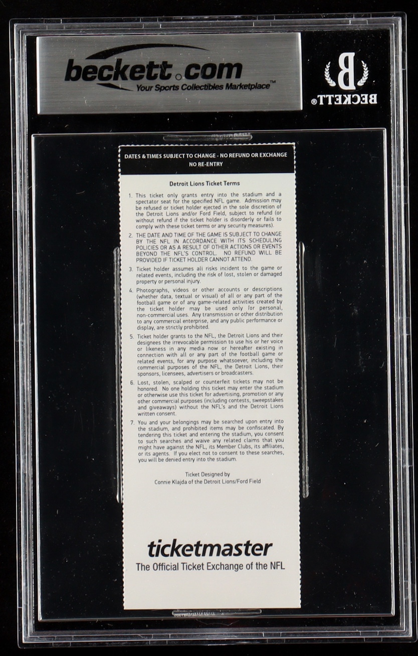 Detroit Lions vs. Atlanta Falcons Ticket Stub is dated December 22nd, 2012 and has been graded (BGS) 8. Please note, the ticket is unsigned. Please see photos for more details regarding the condition of the item.