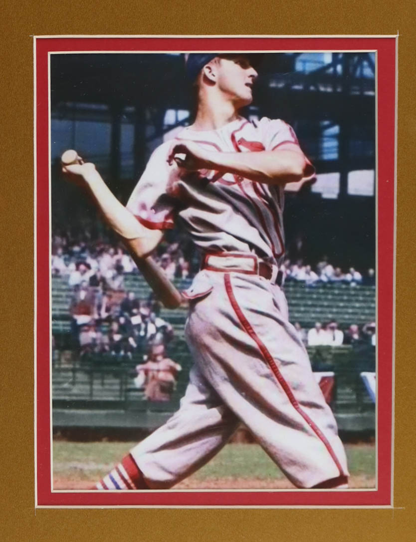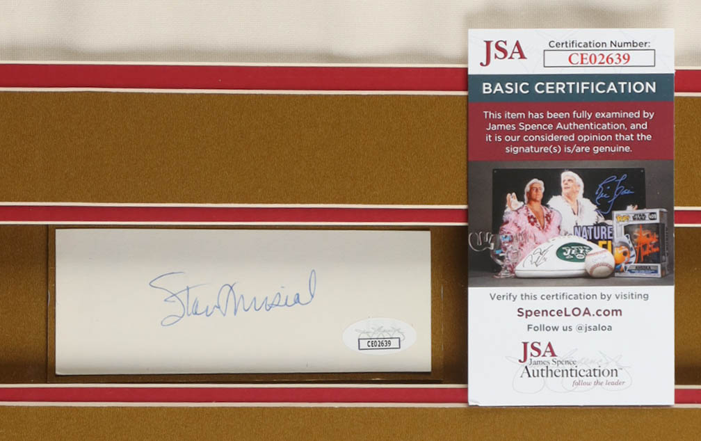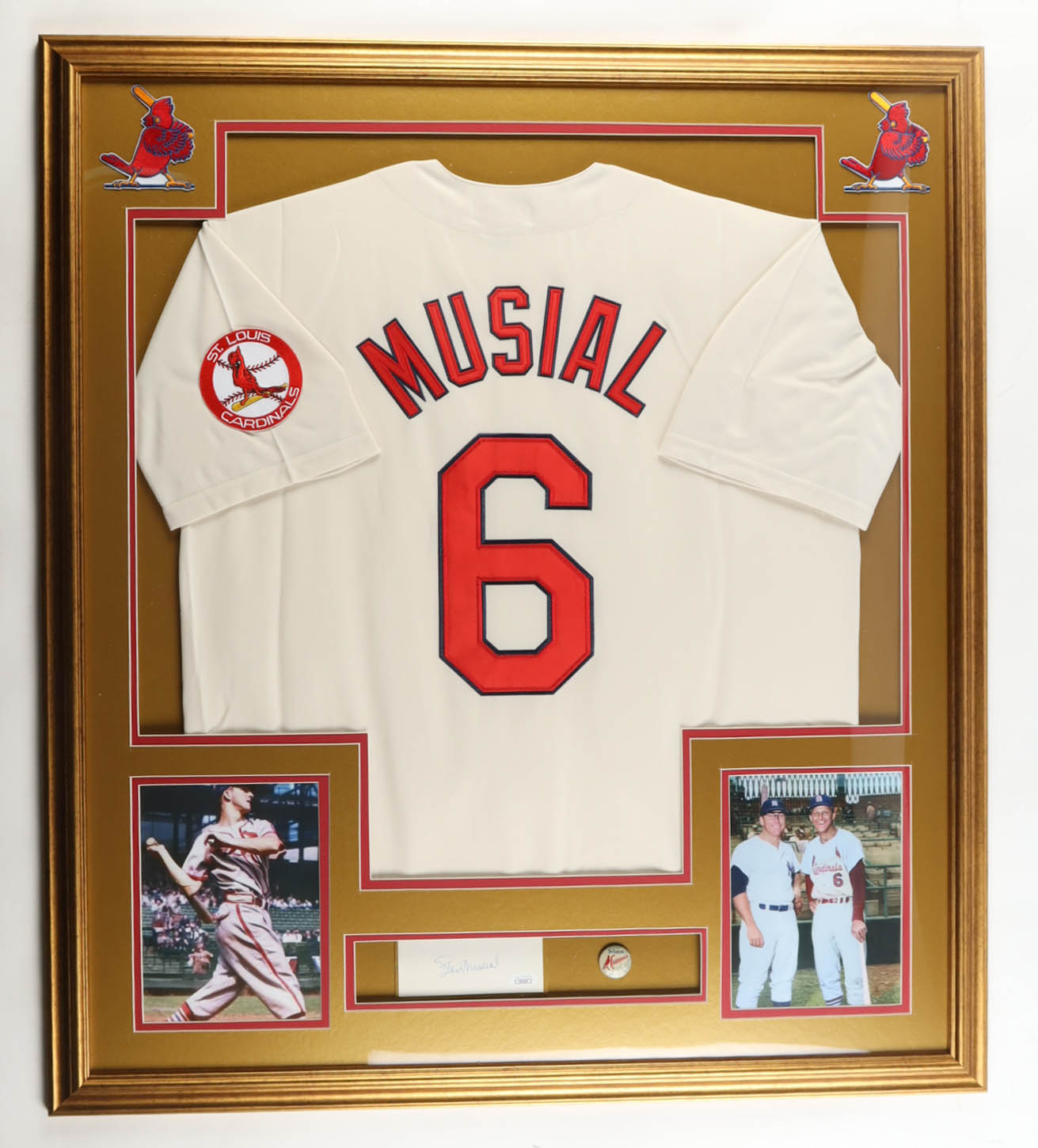 Custom frame measures 32" x 36" in size. Features a cut that has been hand-signed by Stan Musial (D. 2013, St. Louis Cardinals, HOF). Display includes a 1965 St. Louis Pin, (2) 8" x 10" photos, (2) Cardinals Logo Patches, and an unsigned jersey.