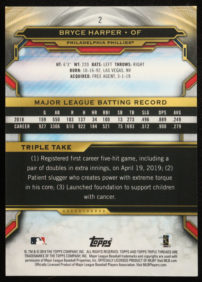 Bryce Harper 2019 Topps Triple Threads Onyx #2 #33/50