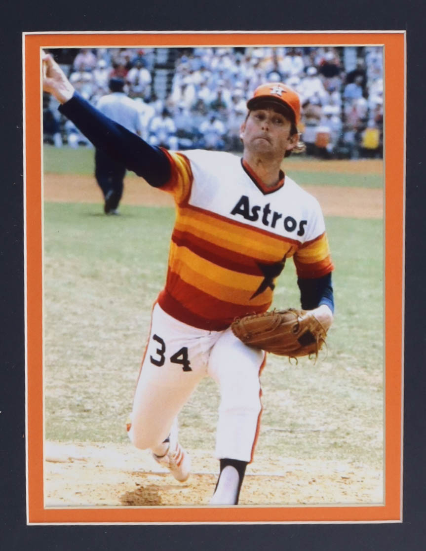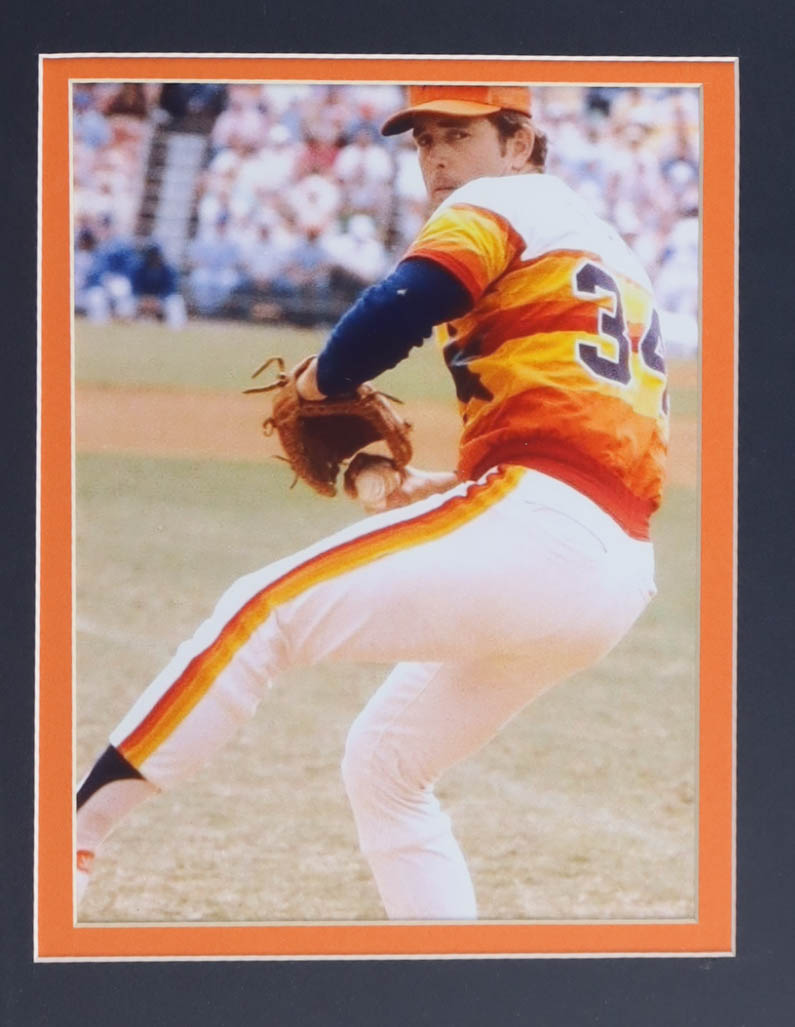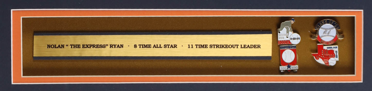 Custom frame display measures approximately 32" x 36" in size and features a jersey that has been hand-signed and inscribed by Nolan Ryan (Houston Astros, HOF). The display also includes a set of (4) Nolan Ryan Career Achievement pins, (2) 8" x 10" photos and (2) cloth team logo patches and a career statistics plaque.