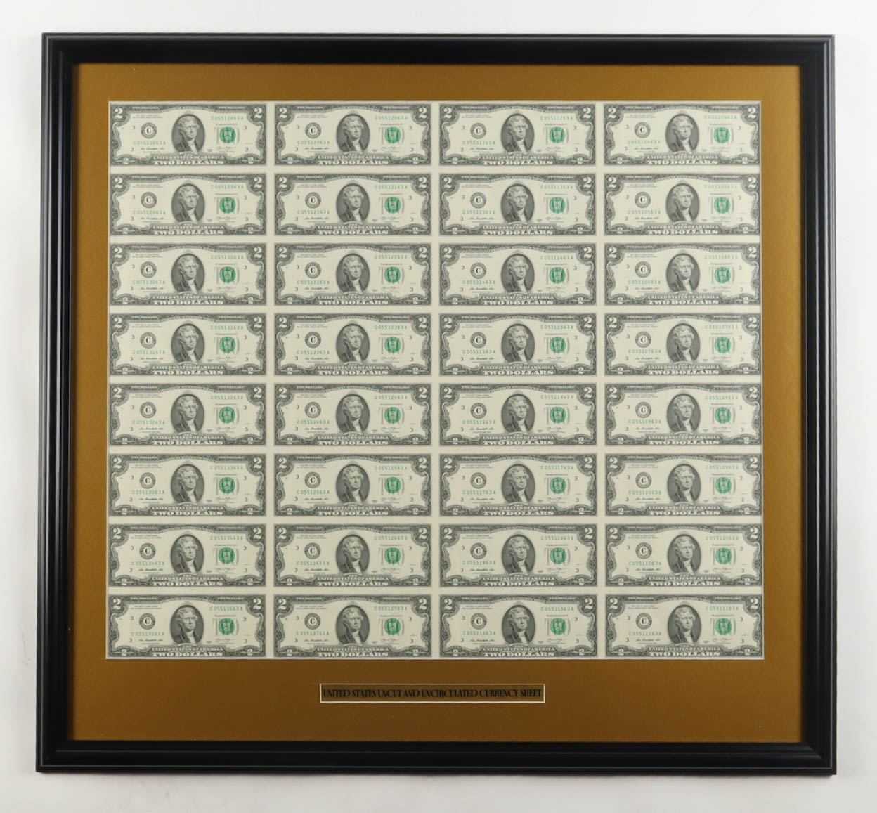 Custom frame measures approximately 28" x 30" in size and features an uncut sheet of (32) 2013 U.S. $2 dollar bills. Please note, the display is unsigned.
