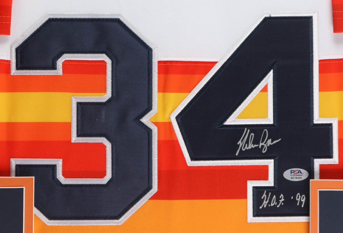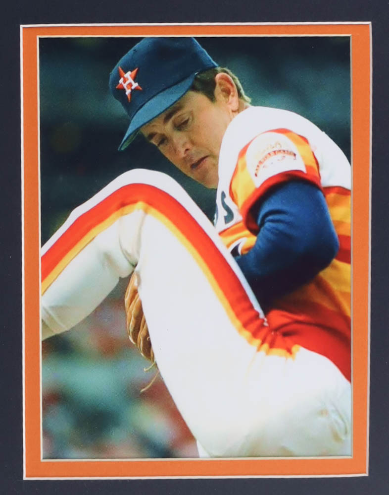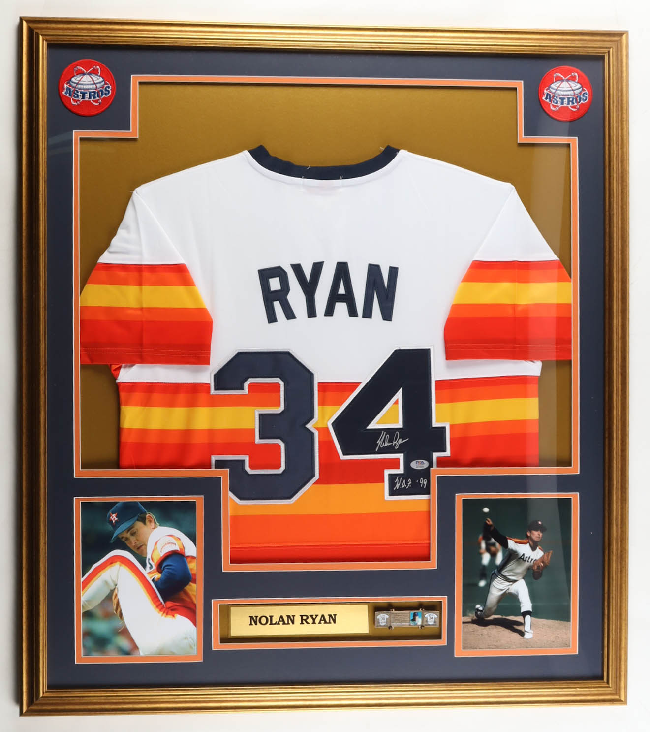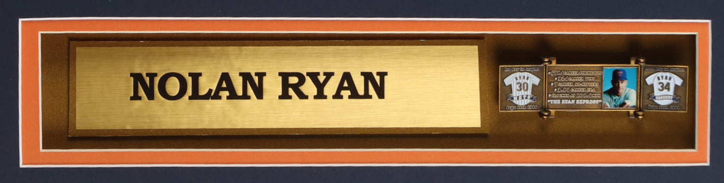 Custom frame display measures approximately 32" x 36" in size and features a jersey that has been hand-signed and inscribed by Nolan Ryan (Houston Astros, HOF). The display also includes (2) 8" x 10" photos, (2) cloth team logo patches, bronze hall of fame plaque and a Ryan title plaque.