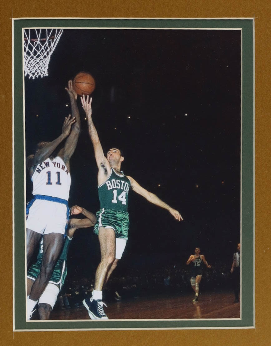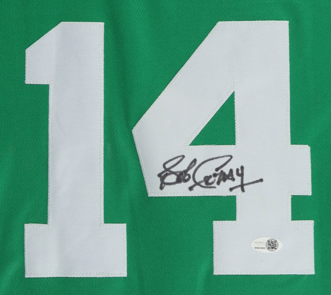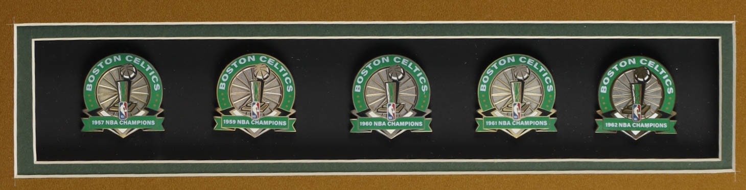 Custom frame measures approximately 32.5" x 36.5" in size and features a jersey that has been hand-signed by Bob Cousy (Boston Celtics, HOF). The display also includes (5) Boston Celtics Championship pins, (2) photos and (2) Boston Celtics metal emblems.