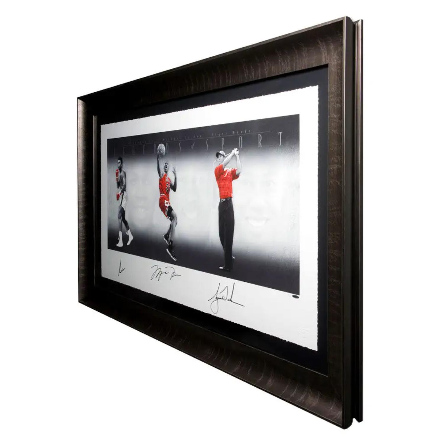 Custom frame measures 33" x 58" in size and features a platinum lithograph that has been hand-signed by Michael Jordan (Chicago Bulls, HOF), Tiger Woods (HOF), and Muhammad Ali (D. 2016, HOF). This item is limited edition and has been numbered #/100.