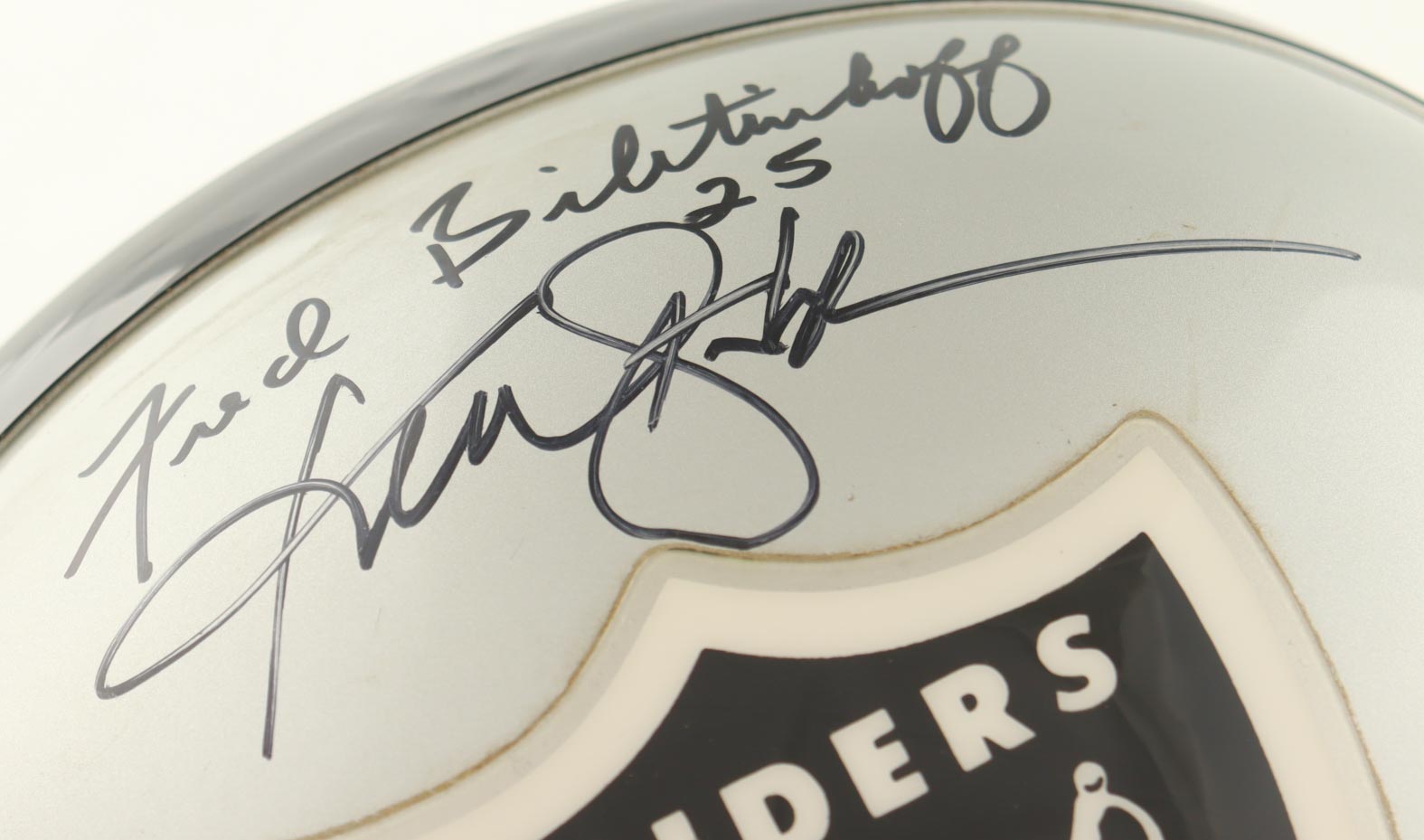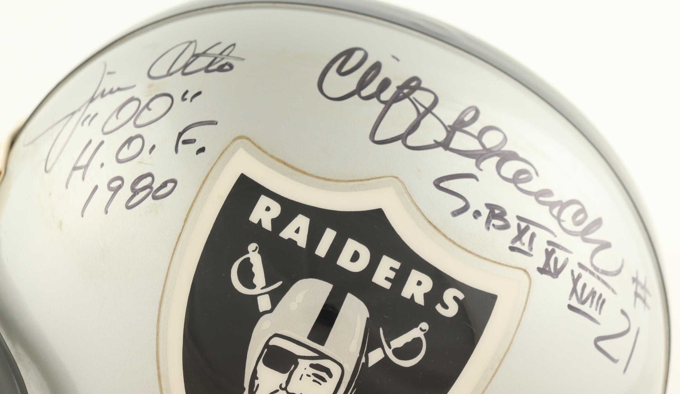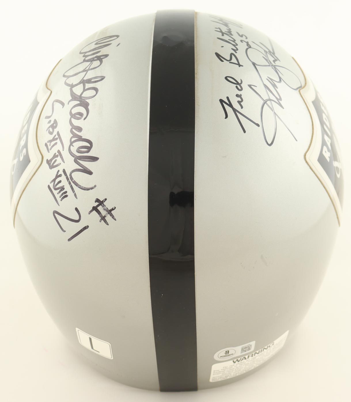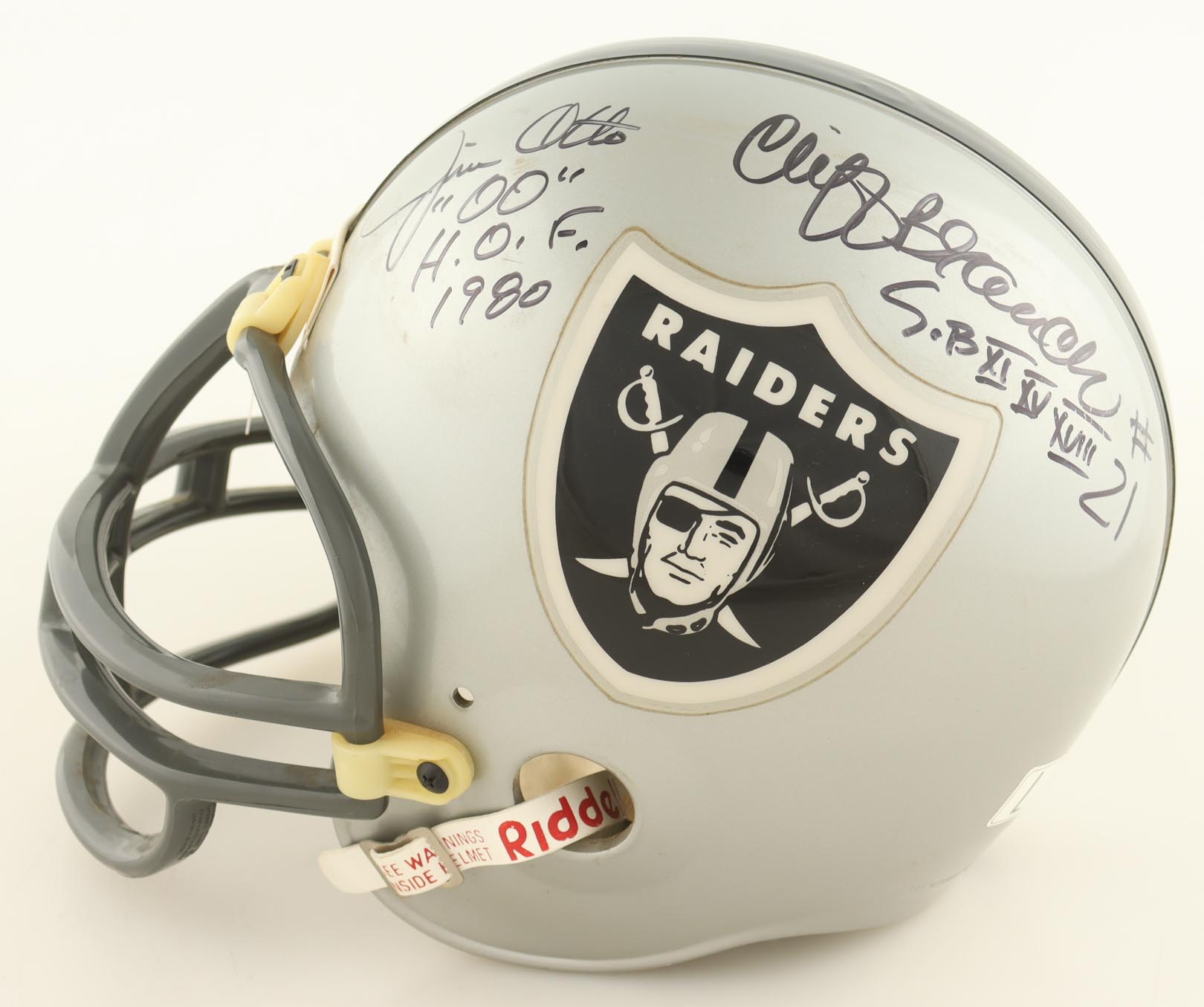 Raiders Full-Size Helmet Signed by (4) with Kenny Stabler, Jim Otto, Cliff Branch & Fred Biletnikoff with Multiple Career Inscriptions (Beckett)
