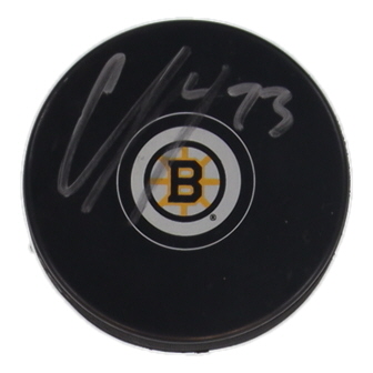 Boston Bruins Logo Hockey Puck. Hand-signed by Charlie McAvoy. Please note the faded signature.