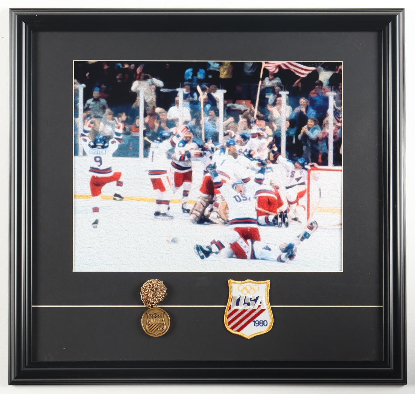 Custom frame measures 19" x 20" in size and features a photo the the 1980 Team USA Hockey team. Please note that the item is unsigned. Please see photos for details regarding the condition of the item. Display also includes a 1980 Team USA Olympic Patch and brass olympics emblem.