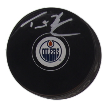 Edmonton Oilers logo hockey puck. Hand-signed by Trent Frederic.