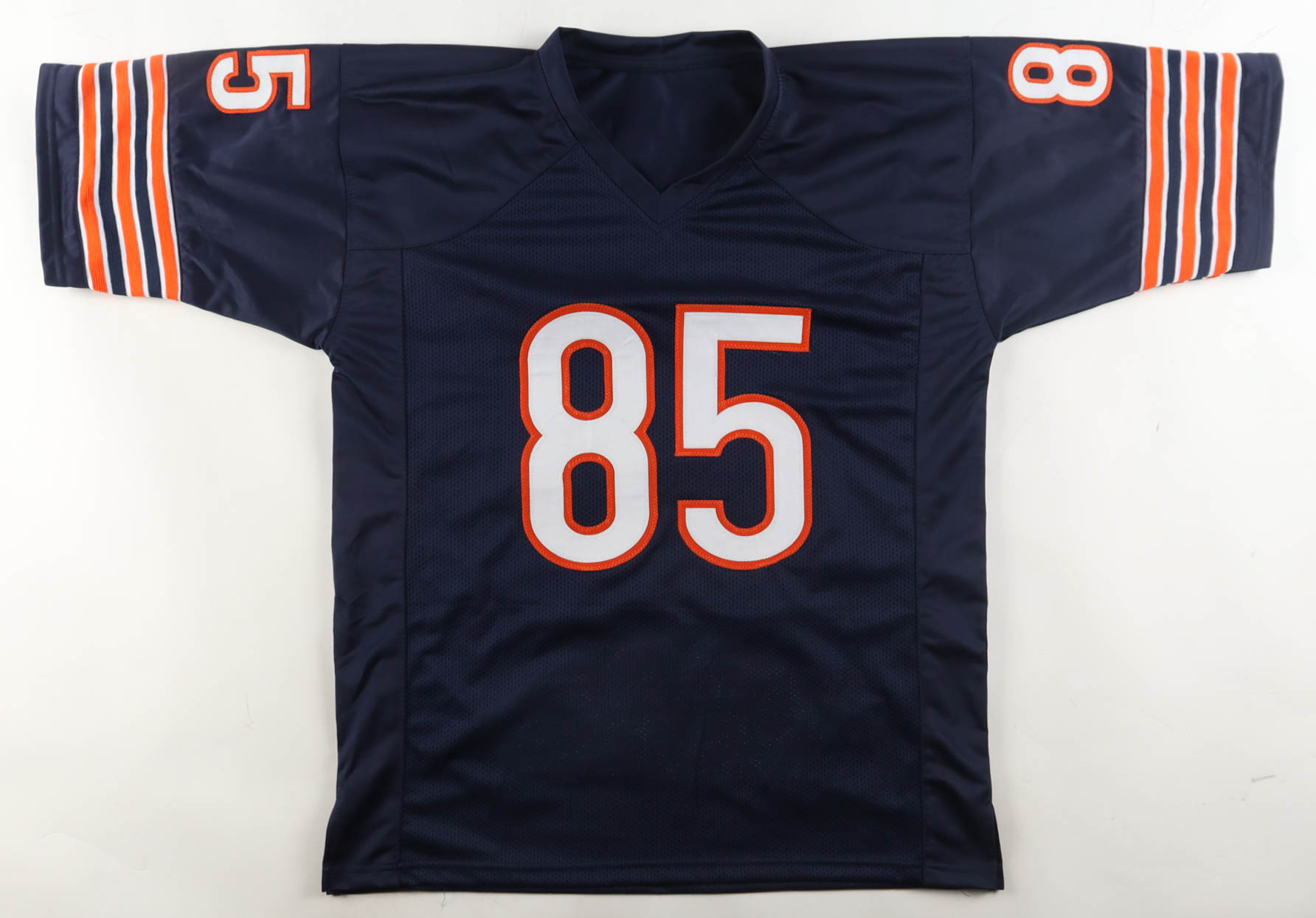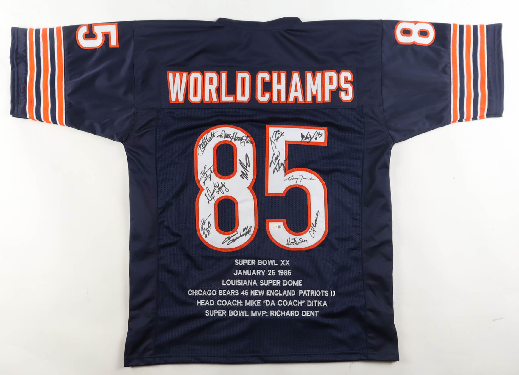 Custom jersey with everything sewn on, size XL. Hand-signed by (14) with Mike Singletary (HOF), Gary Fencik, Dennis Gentry, Willie Gault, Shaun Gayle, Stefan Humphries, Tyrone Keys, Dennis McKinnon, Brian Baschnagel, Kurt Becker, Kevin Butler, Calvin Thomas & 2 others. The Super Bowl highlights have been custom stitched onto the back of the jersey below the reverse numbers.