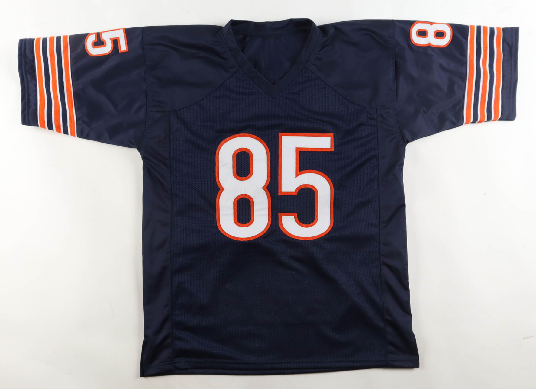 Custom jersey with everything sewn on, size XL. Hand-signed by (14) with Mike Singletary (HOF), Gary Fencik, Dennis Gentry, Willie Gault, Shaun Gayle, Stefan Humphries, Tyrone Keys, Dennis McKinnon, Brian Baschnagel, Kurt Becker, Kevin Butler, Calvin Thomas & 2 others. The Super Bowl highlights have been custom stitched onto the back of the jersey below the reverse numbers.