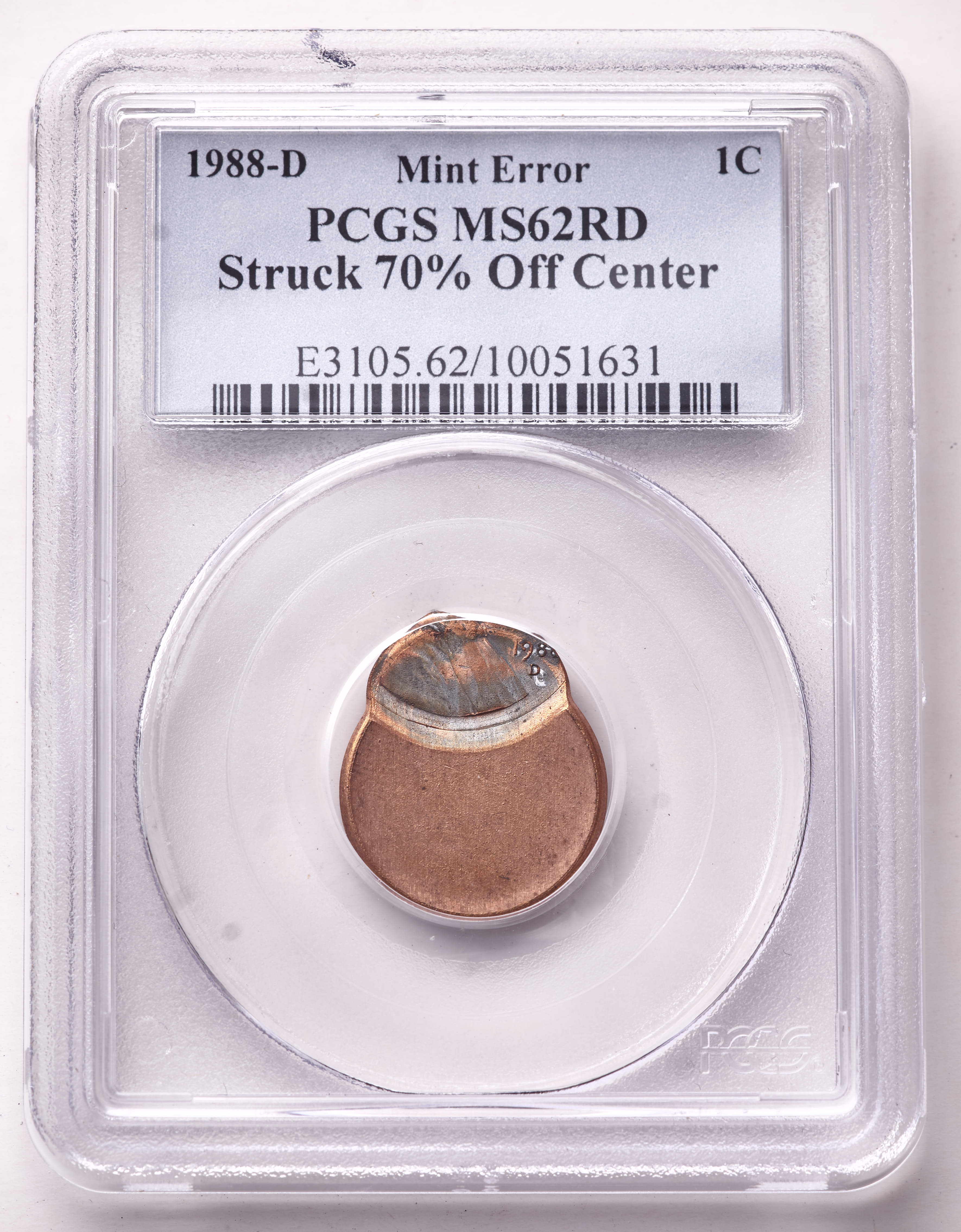 Mint Error 1988-D Lincoln Cent Struck 70% Off Center (PCGS MS62 RD)