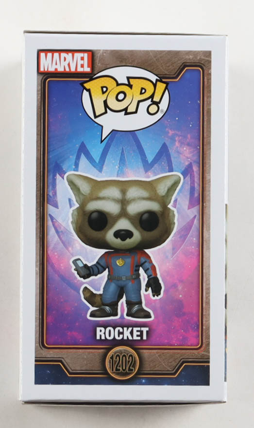 Vinyl figure measures approximately 4" tall and has been hand-signed on the packaging by Bradley Cooper (Rocket).