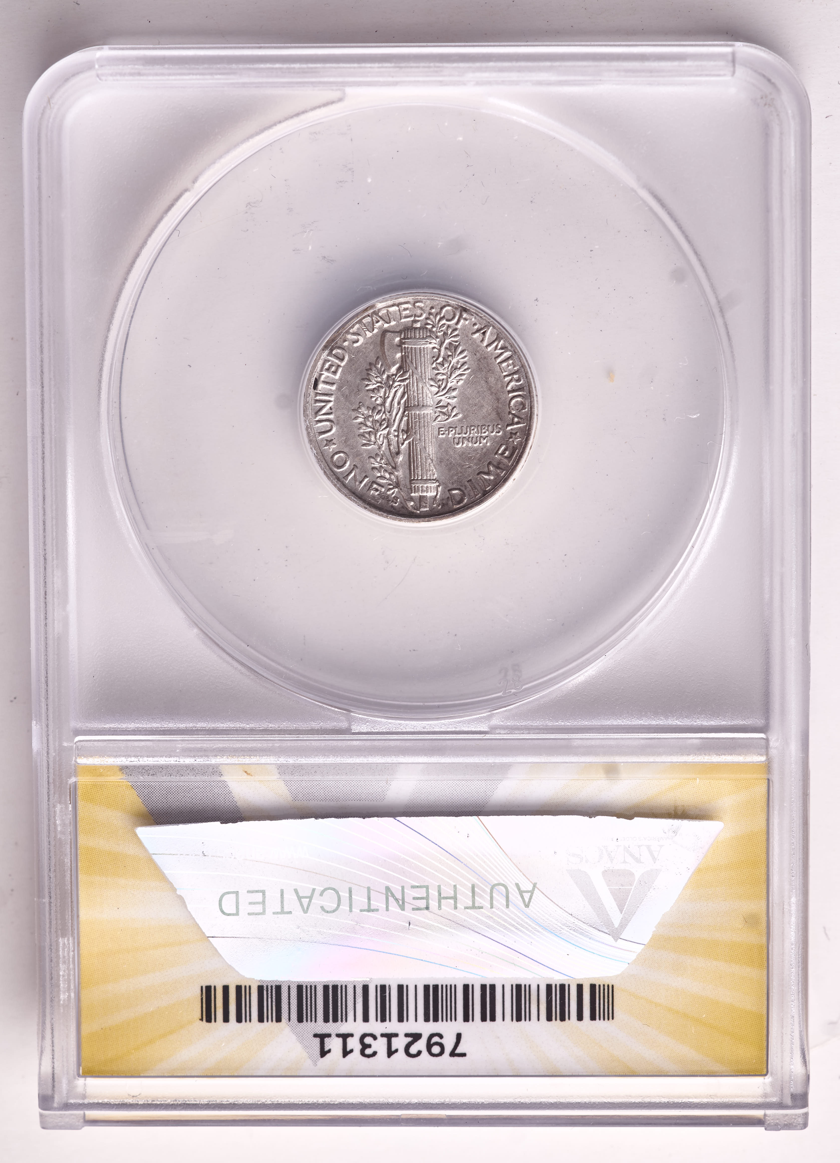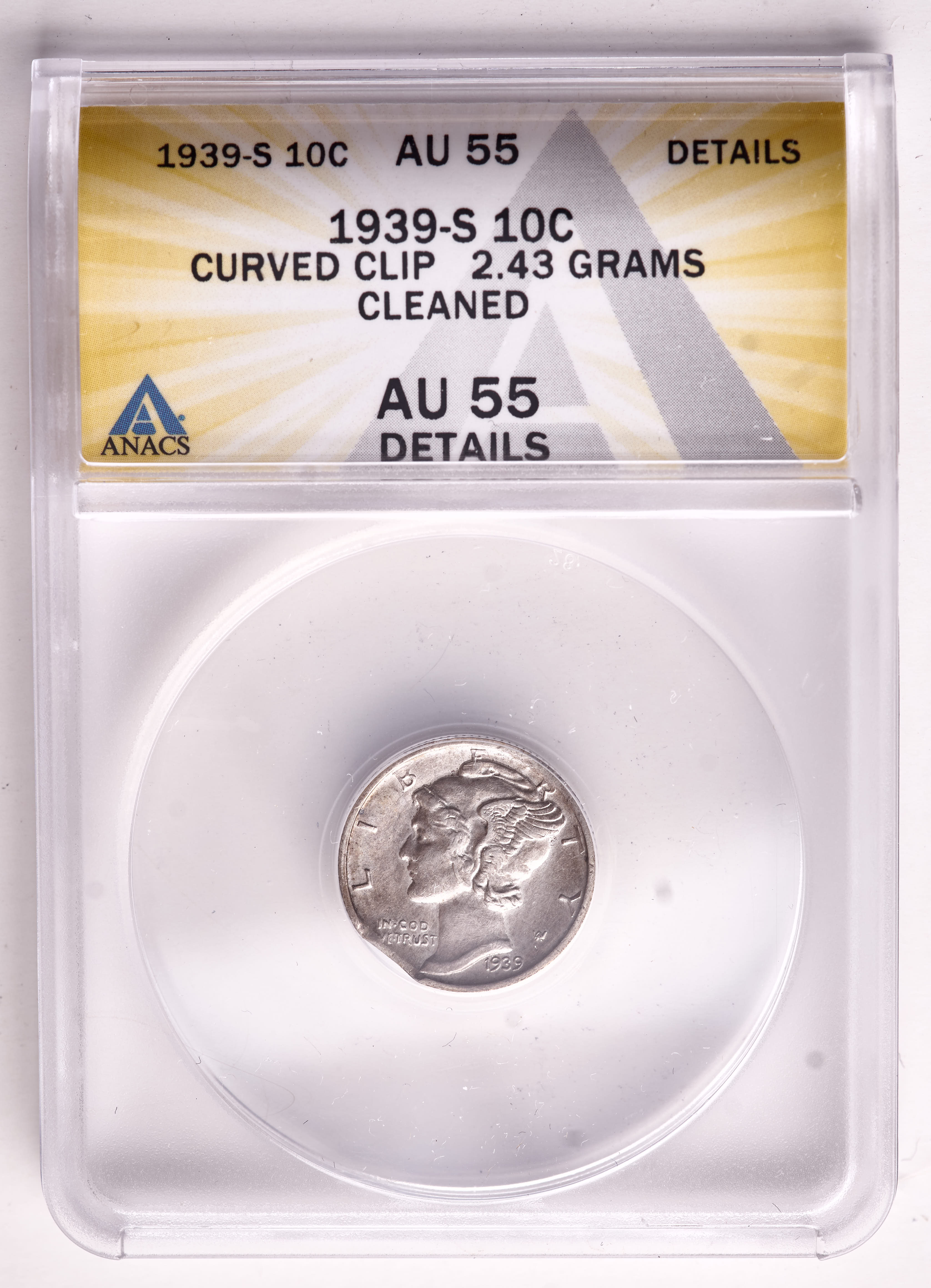 Mint Error 1939-S Mercury Dime Curved Clip 2.43 Grams (ANACS AU55 Details)