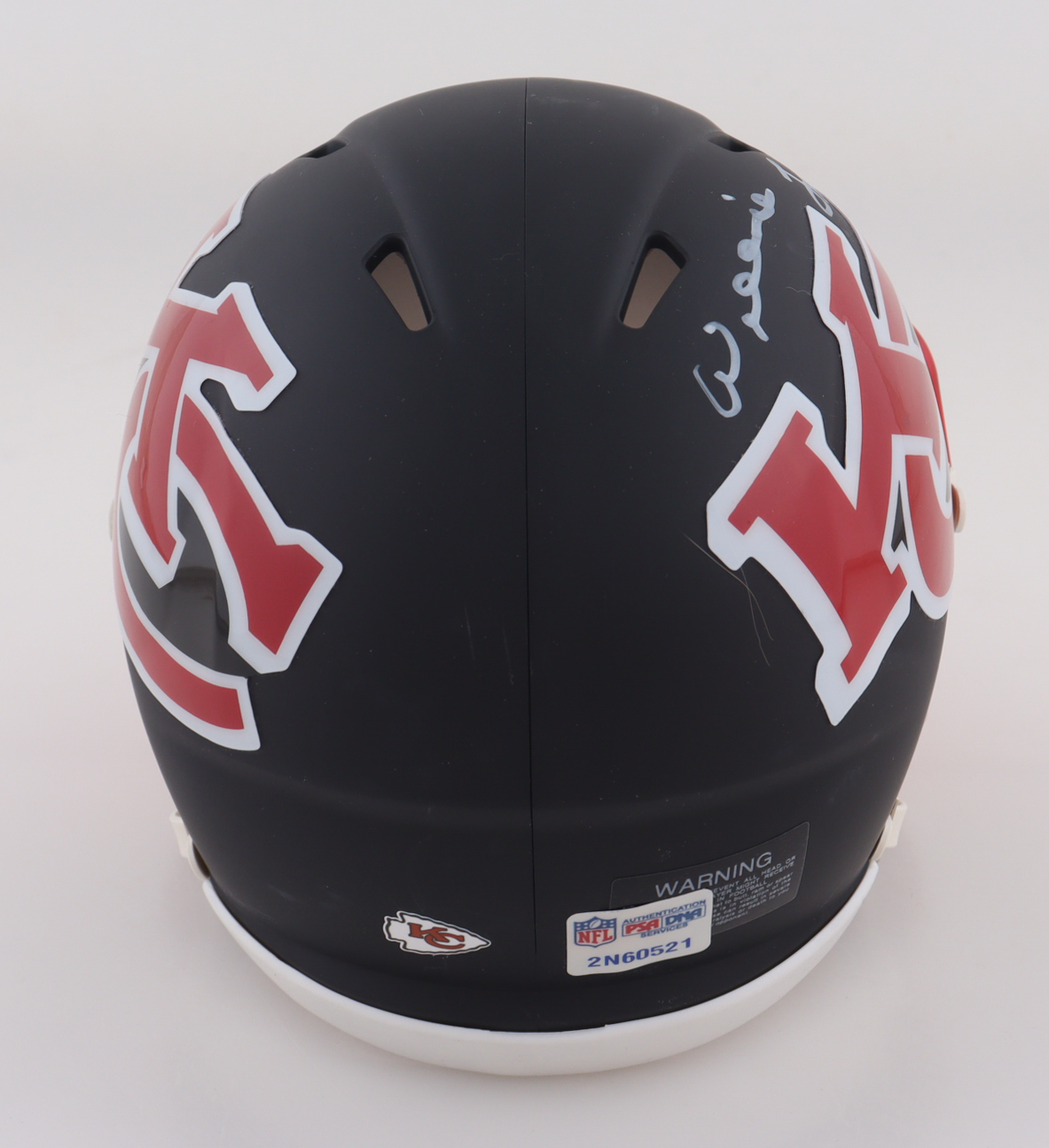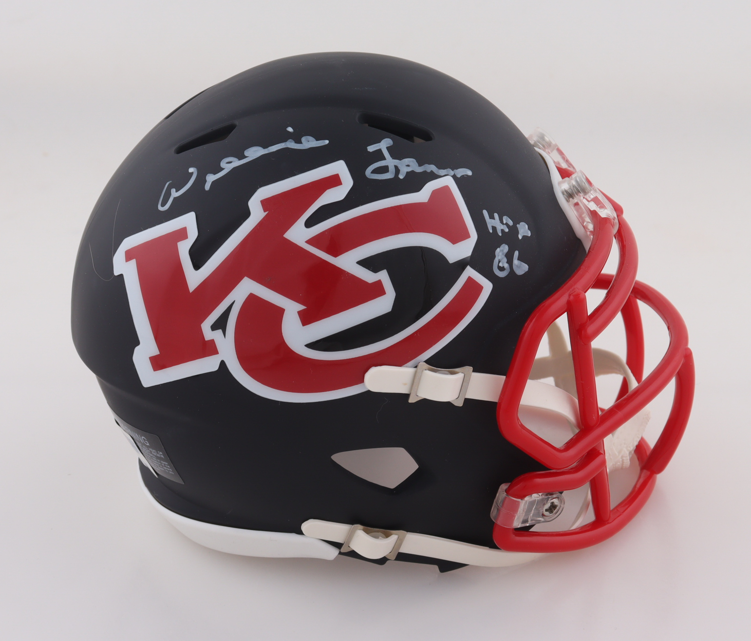 Riddell Kansas City Chiefs AMP alternate speed mini helmet has been hand-signed and inscribed by Willie Lanier (HOF).