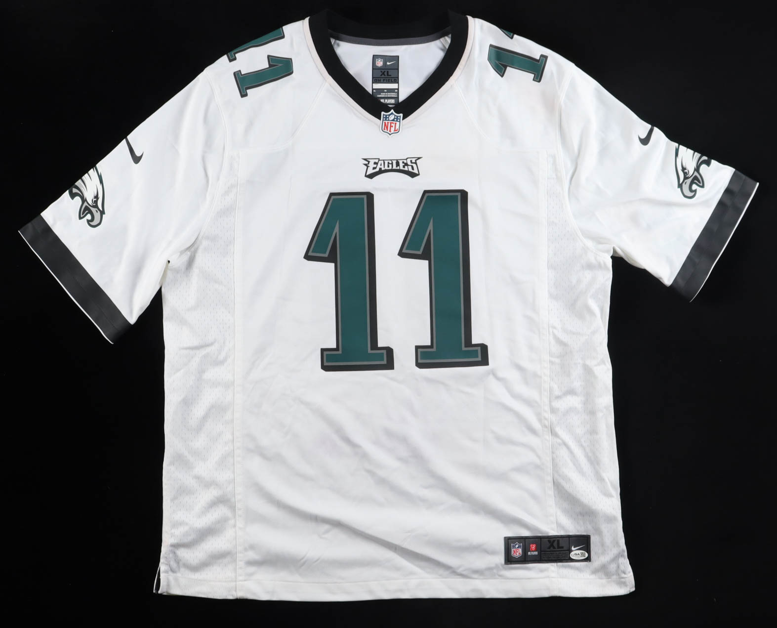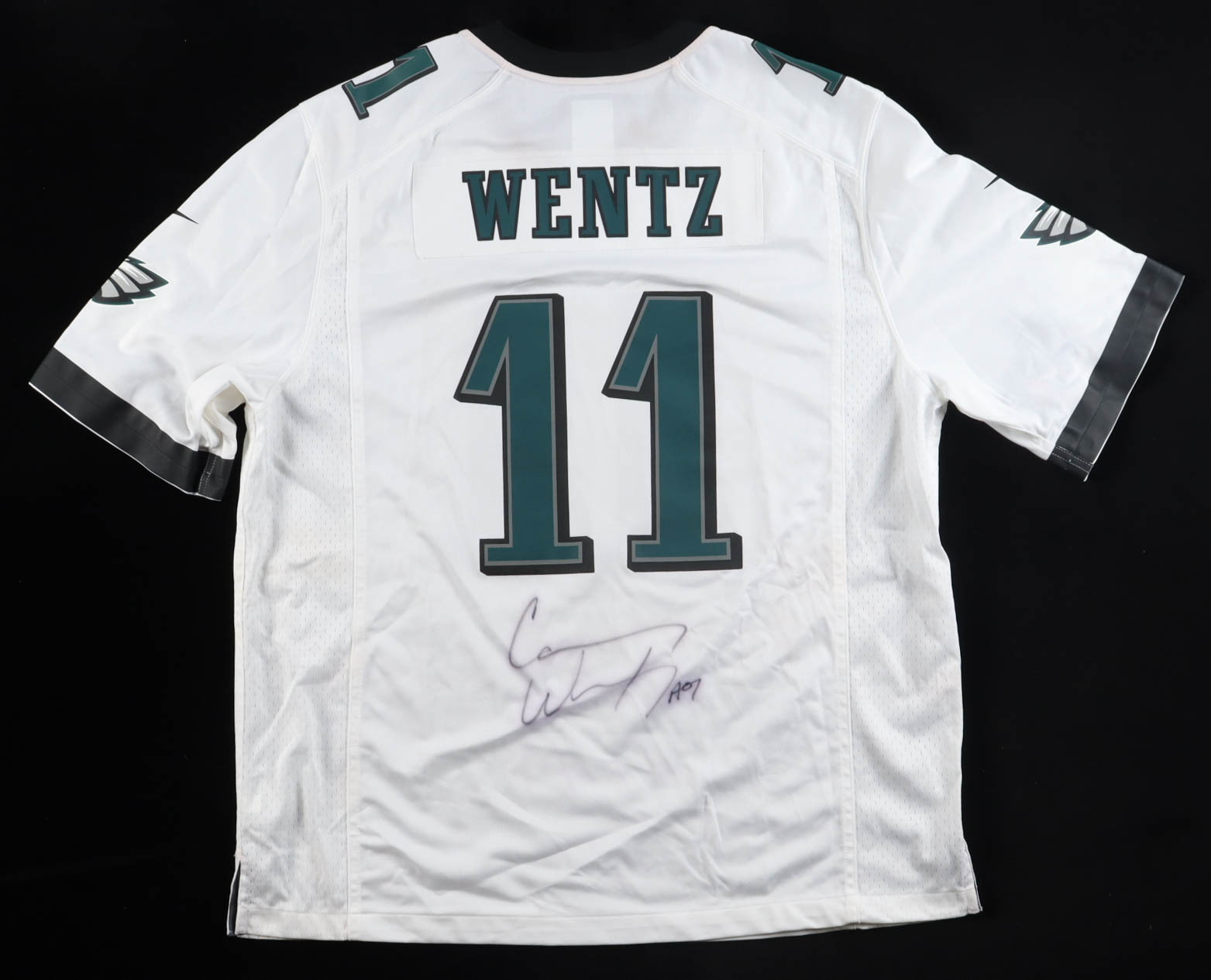 Nike authentic jersey with everything pressed on, size XL. Hand-signed and inscribed by Carson Wentz (Philadelphia Eagles). Please note, the signature and inscription has bled.