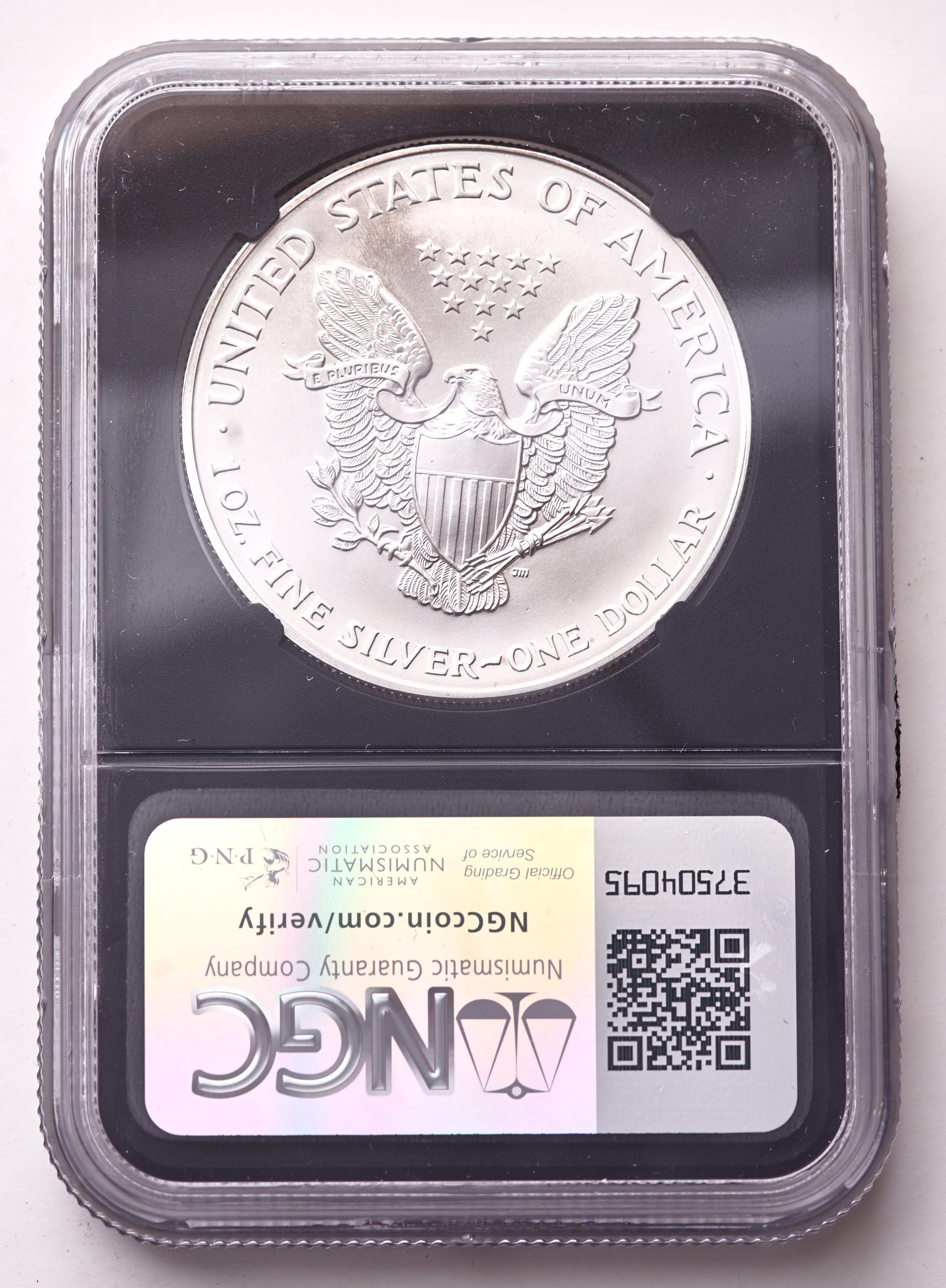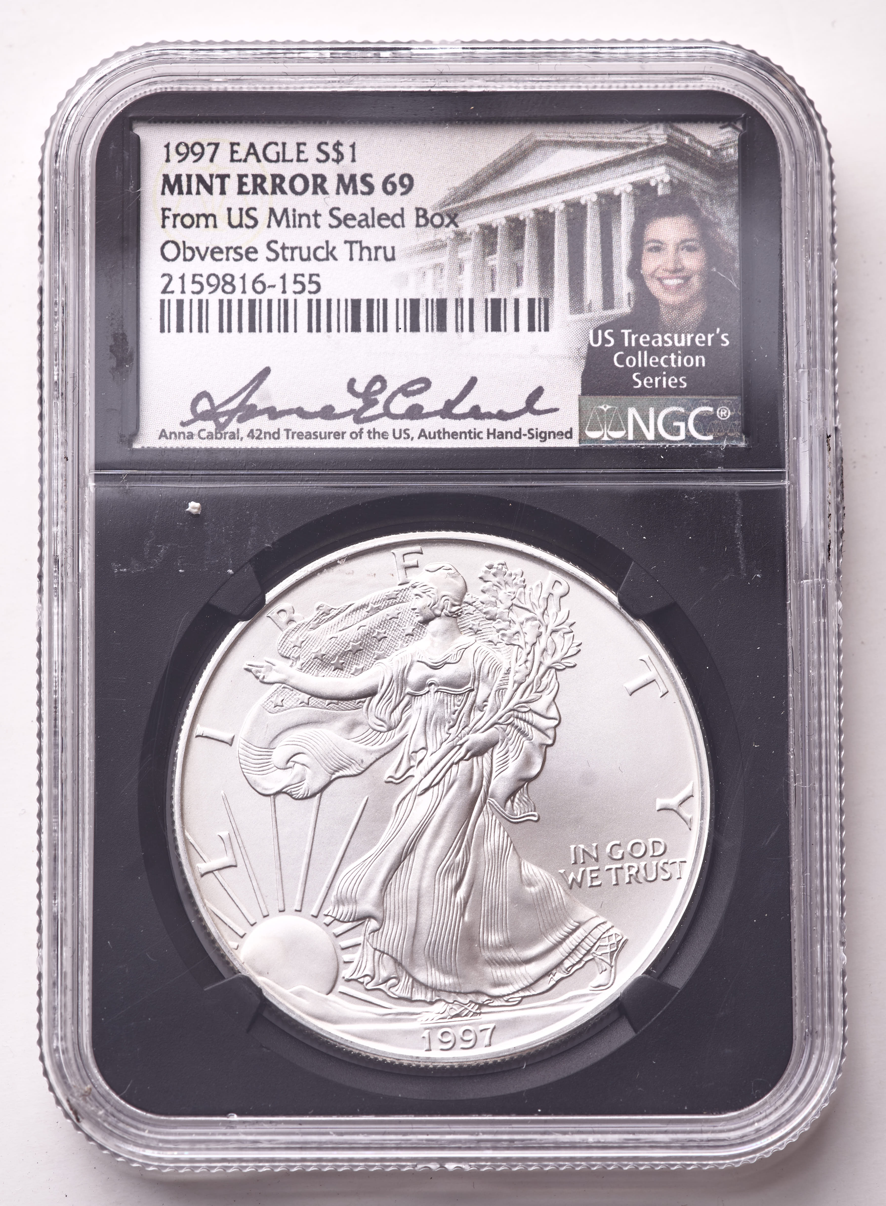 Mint Error 1997 $1 Silver Eagle Obverse Struck Thru Black Core Holder - Anna Cabral Collection Series (NGC MS69)