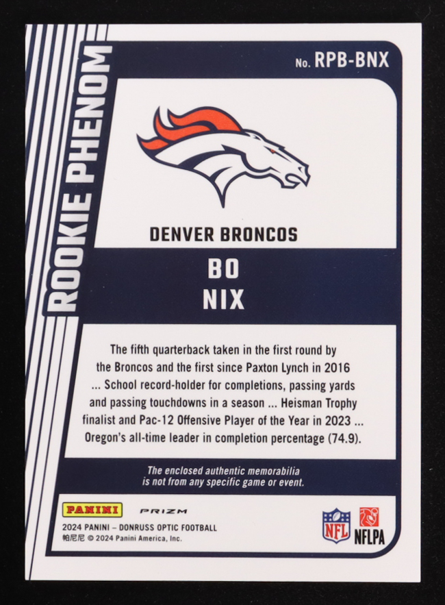 Bo Nix 2024 Donruss Optic Rookie Phenoms Blue Hyper #5 RC