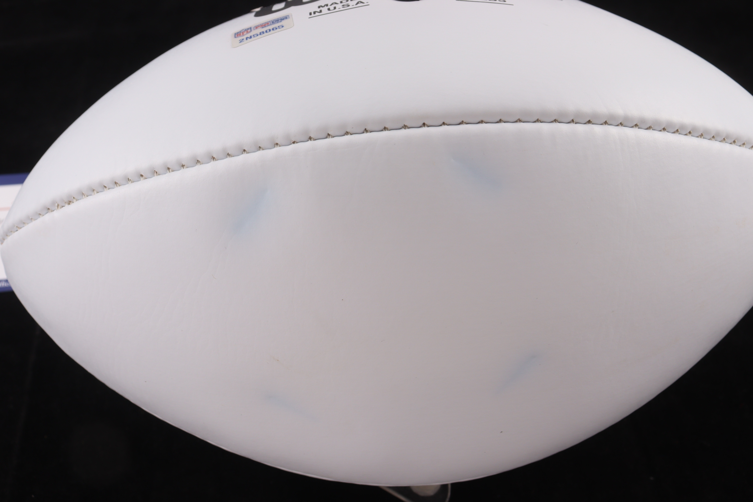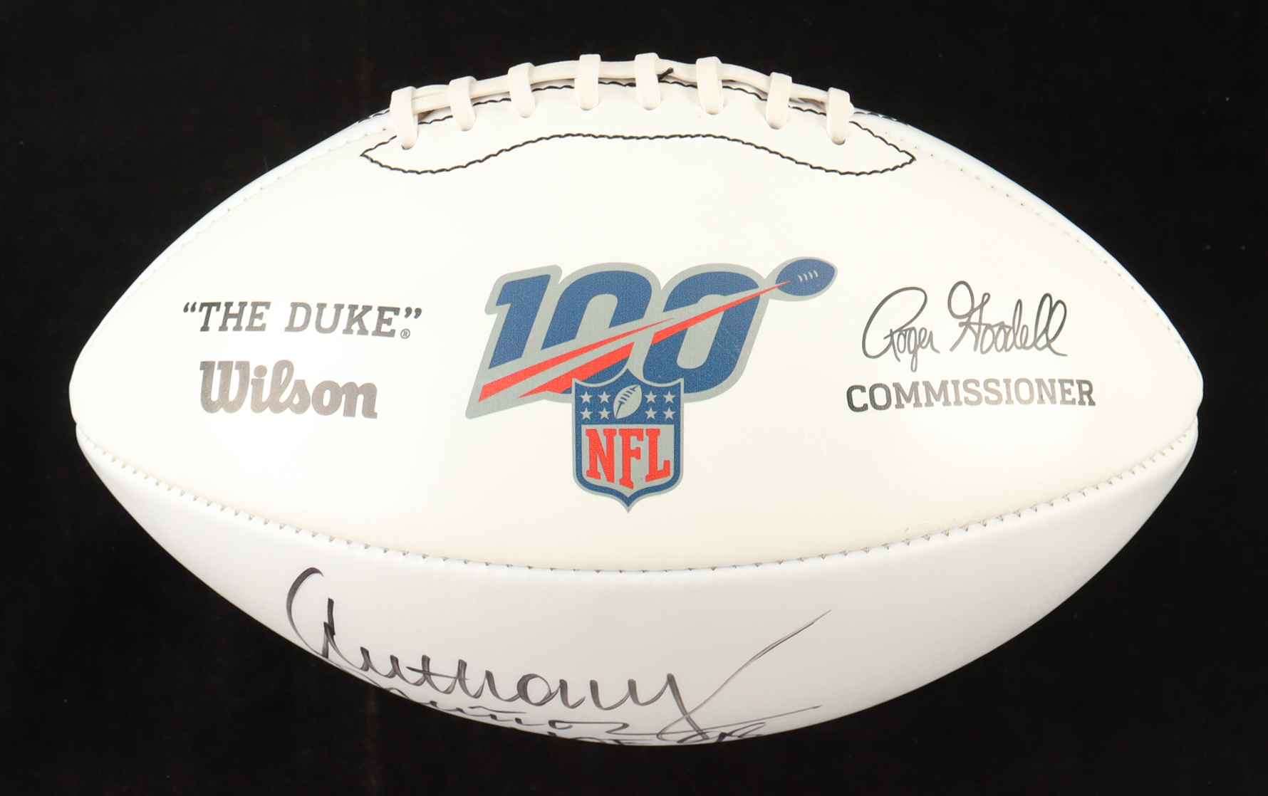 Wilson "The Duke" white panel NFL 100 Years logo football has been hand-signed and inscribed by Anthony Munoz (Cincinnati Bengals, HOF). Please note the residue and stains on the football.