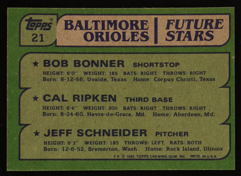 Bob Bonner / Cal Ripken / Jeff Schneider 1982 Topps #21 RC