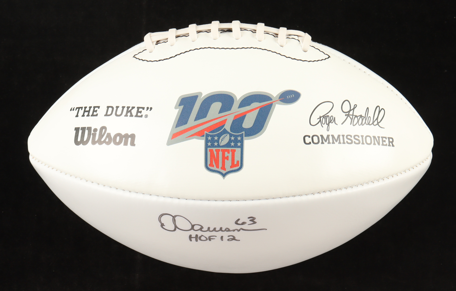 Wilson "The Duke" white panel NFL 100 Years logo football has been hand-signed and inscribed by Dermonti Dawson (Pittsburgh Steelers, HOF).