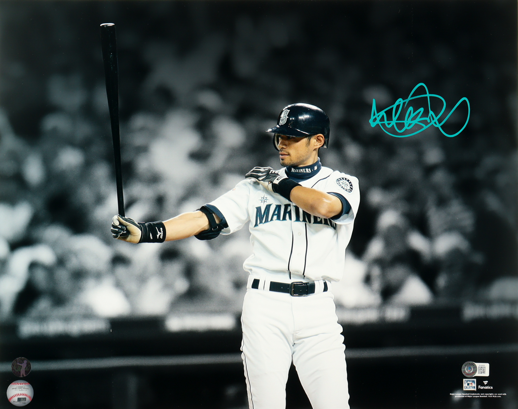 Photo measures 16” x 20” in size and has been hand-signed by Ichiro Suzuki (Seattle Mariners).