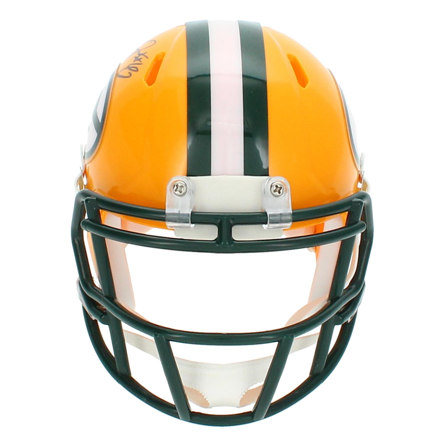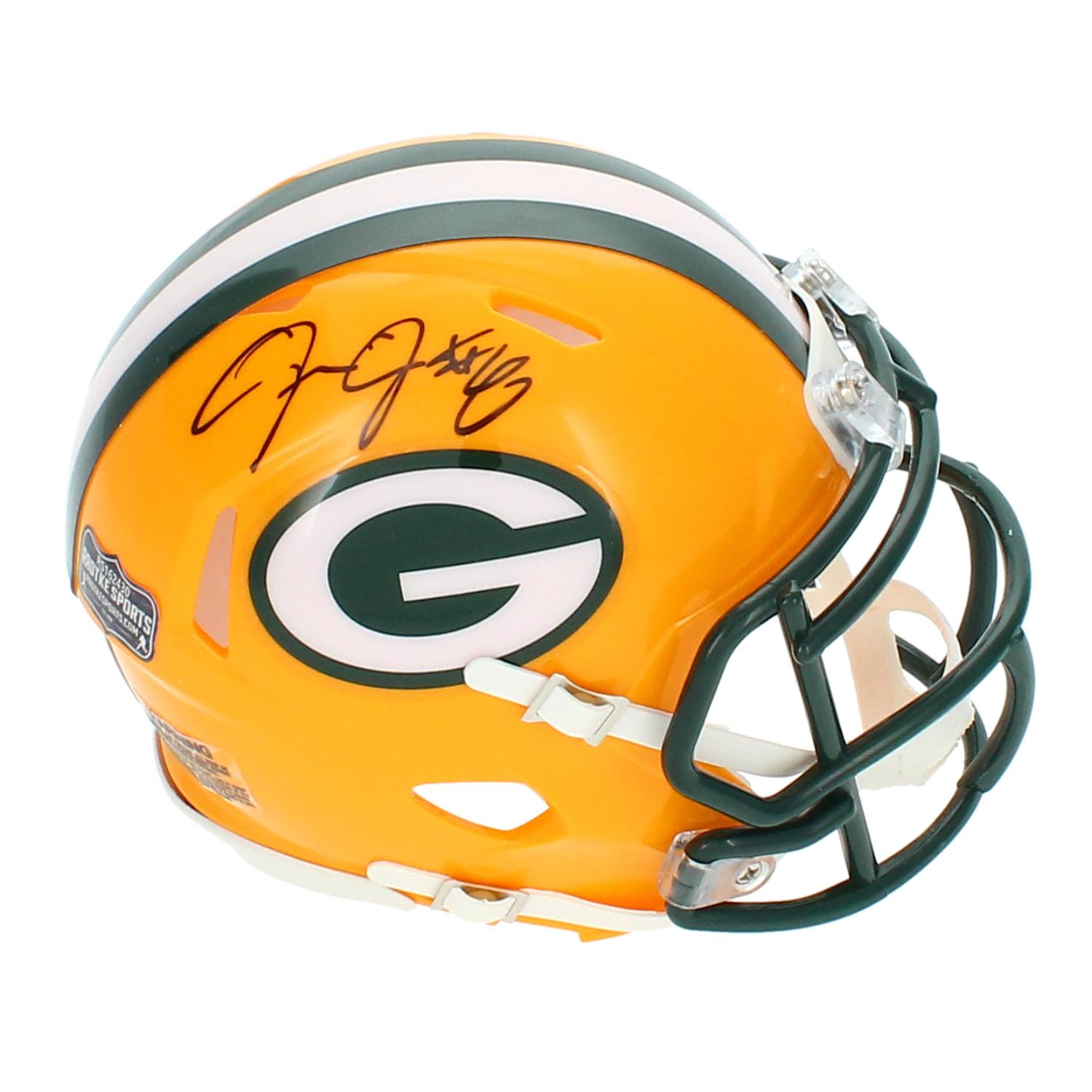 Riddell Green Bay Packers speed mini helmet has been hand-signed by Josh Jacobs.