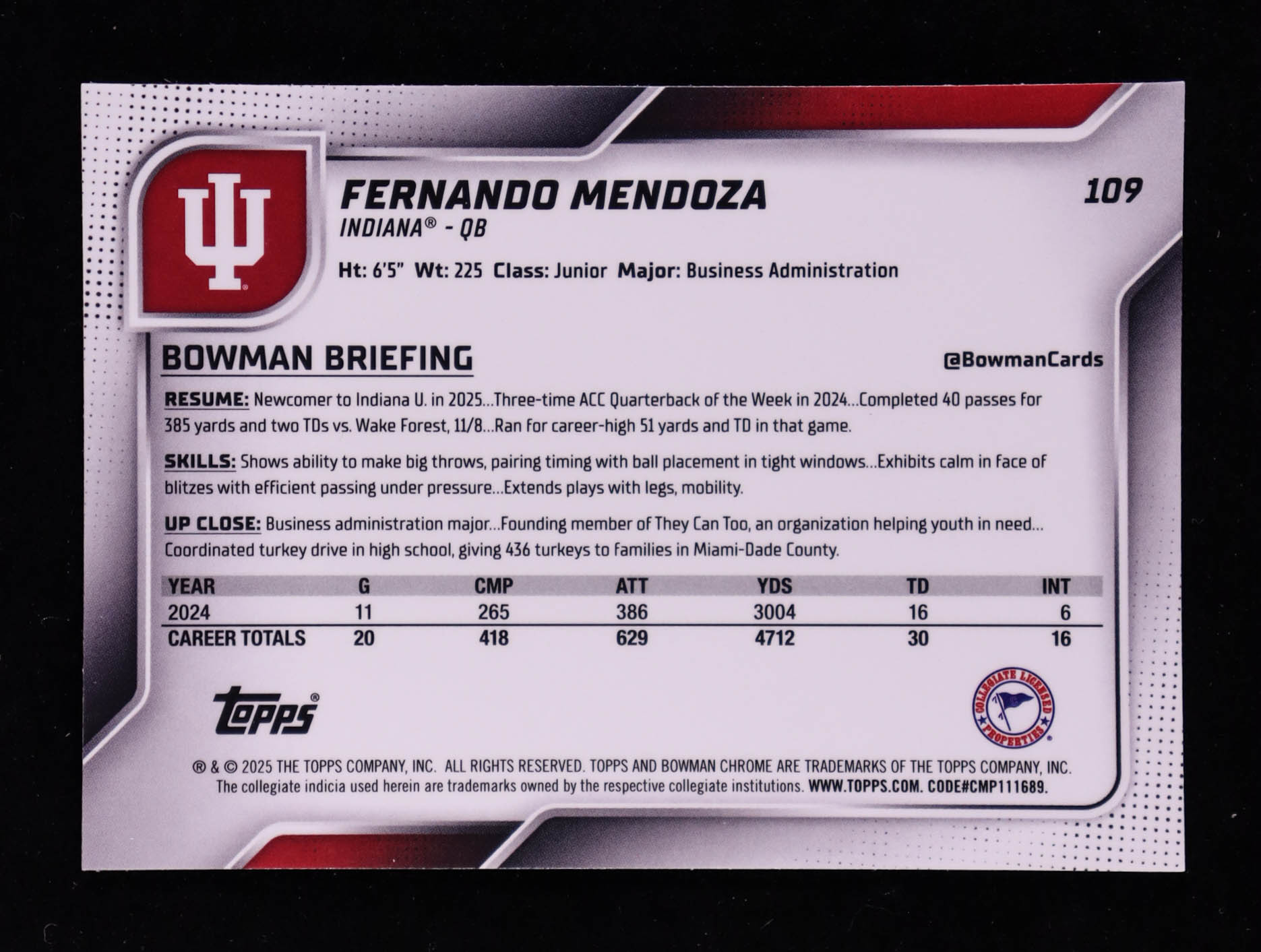 Fernando Mendoza 2025 Bowman Chrome University Pink Lava Refractors #109 RC