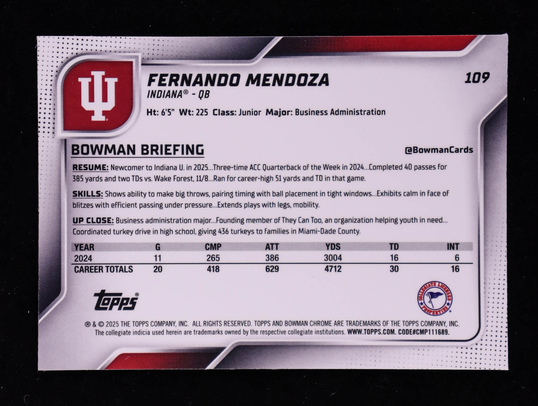 Fernando Mendoza 2025 Bowman Chrome Sapphire University #109 RC