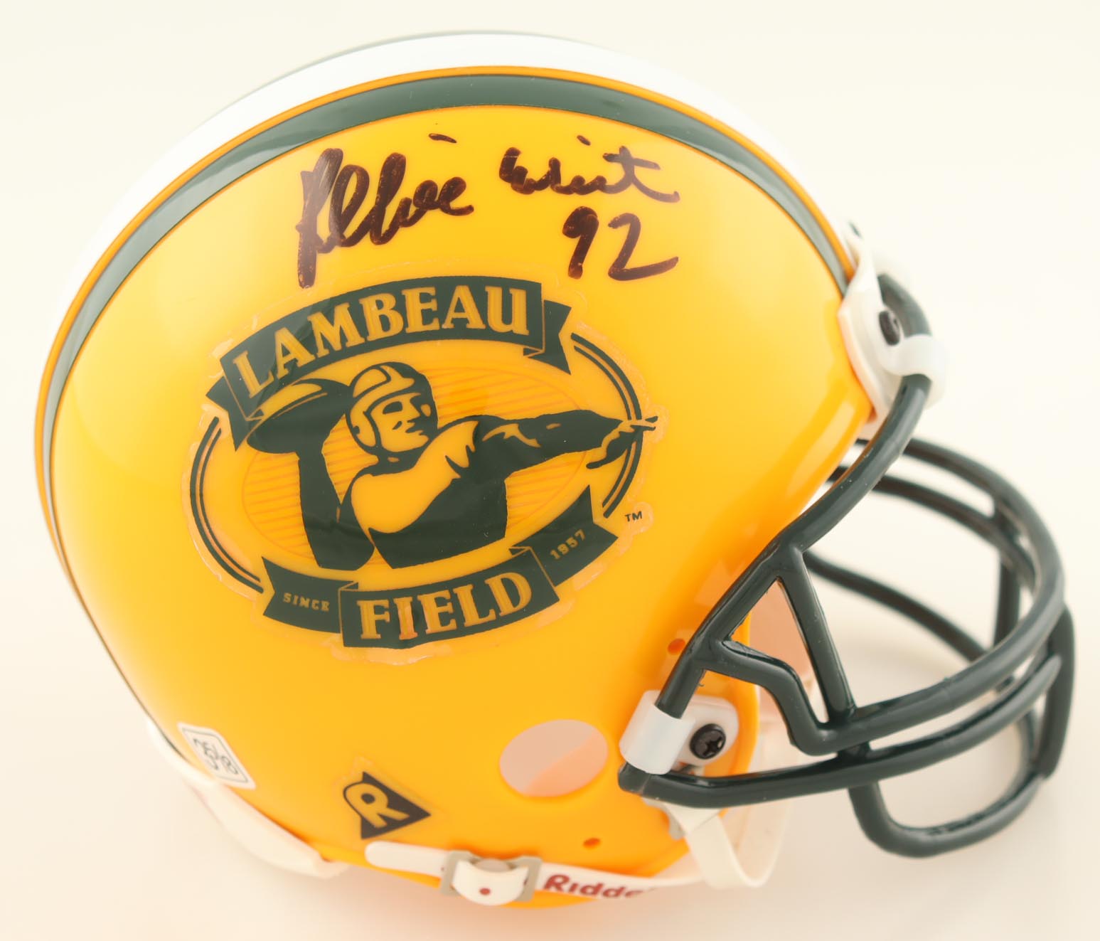 Riddell Green Bay Packers Lambeau Field mini helmet has been hand-signed by Reggie White (D. 2004, HOF).