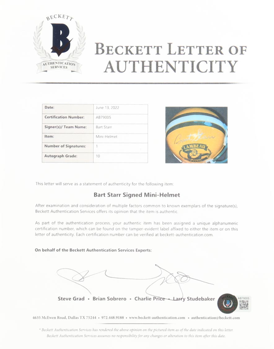 Riddell Green Bay Packers Lambeau Field mini helmet has been hand-signed by Bart Starr. Autograph has been graded (Beckett Auto 10).