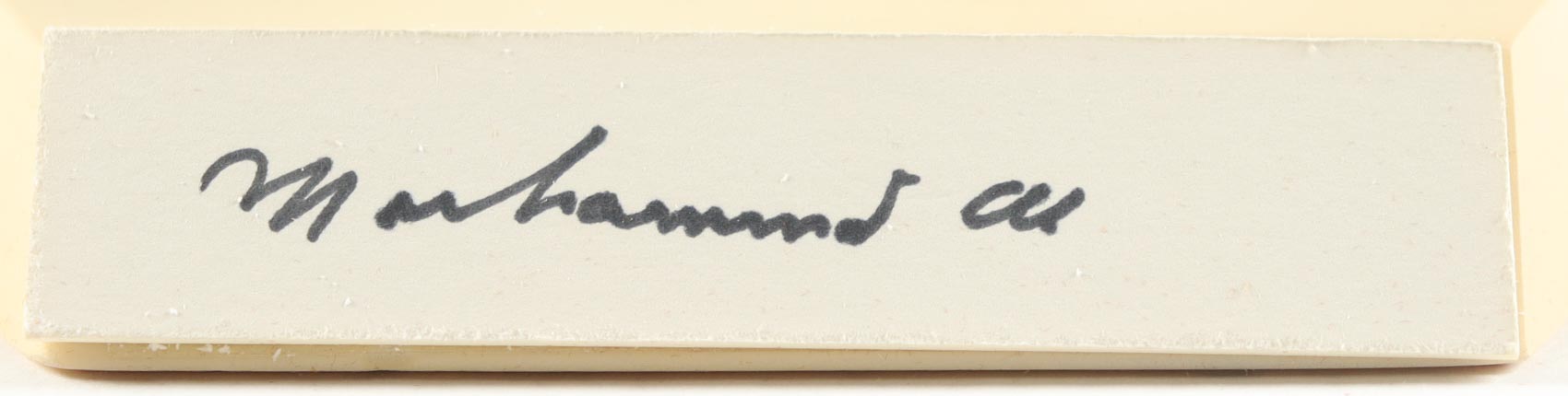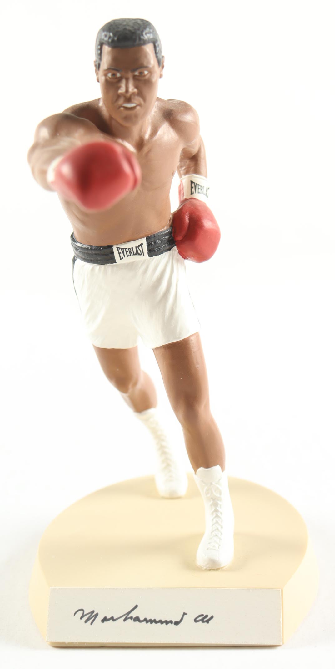 Figurine measures approximately 8" in height. Hand-signed on the base by Muhammad Ali. Please note the weathering on the figure and the residue on the box. Autograph has been graded (Beckett Auto 10).