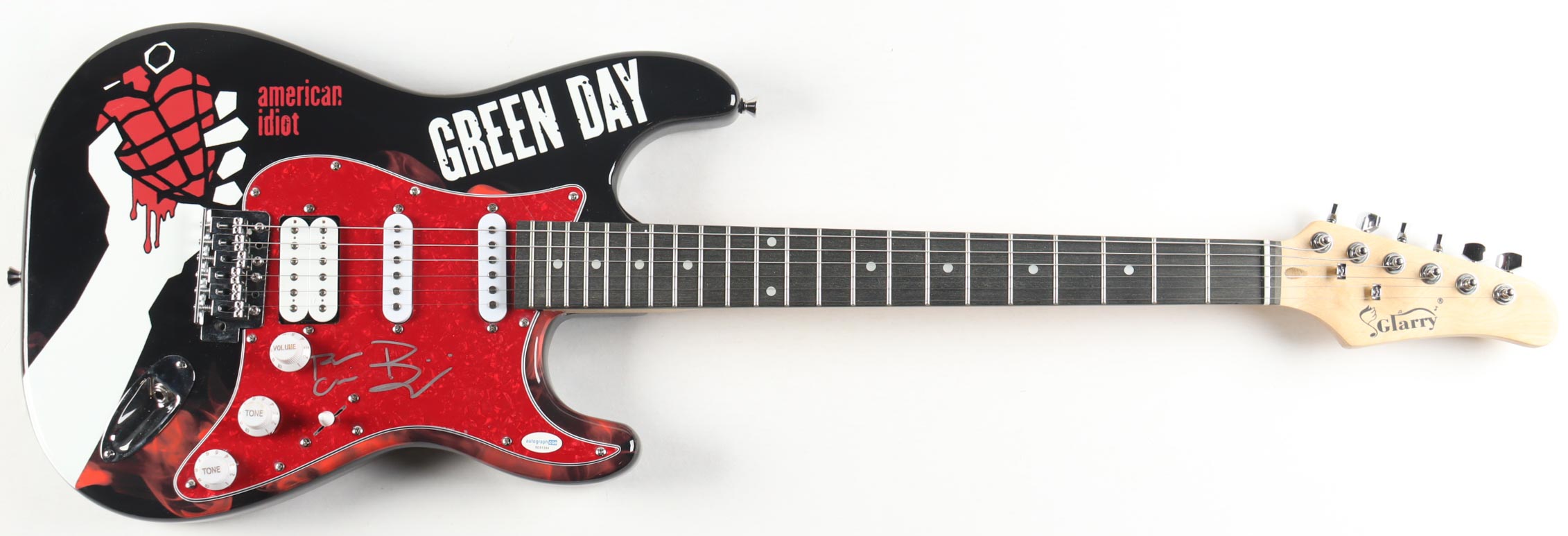 Glarry electric guitar measures approximately 39" in length and has been hand-signed on the pick guard by Billie Joe Armstrong, and Tre Cool.