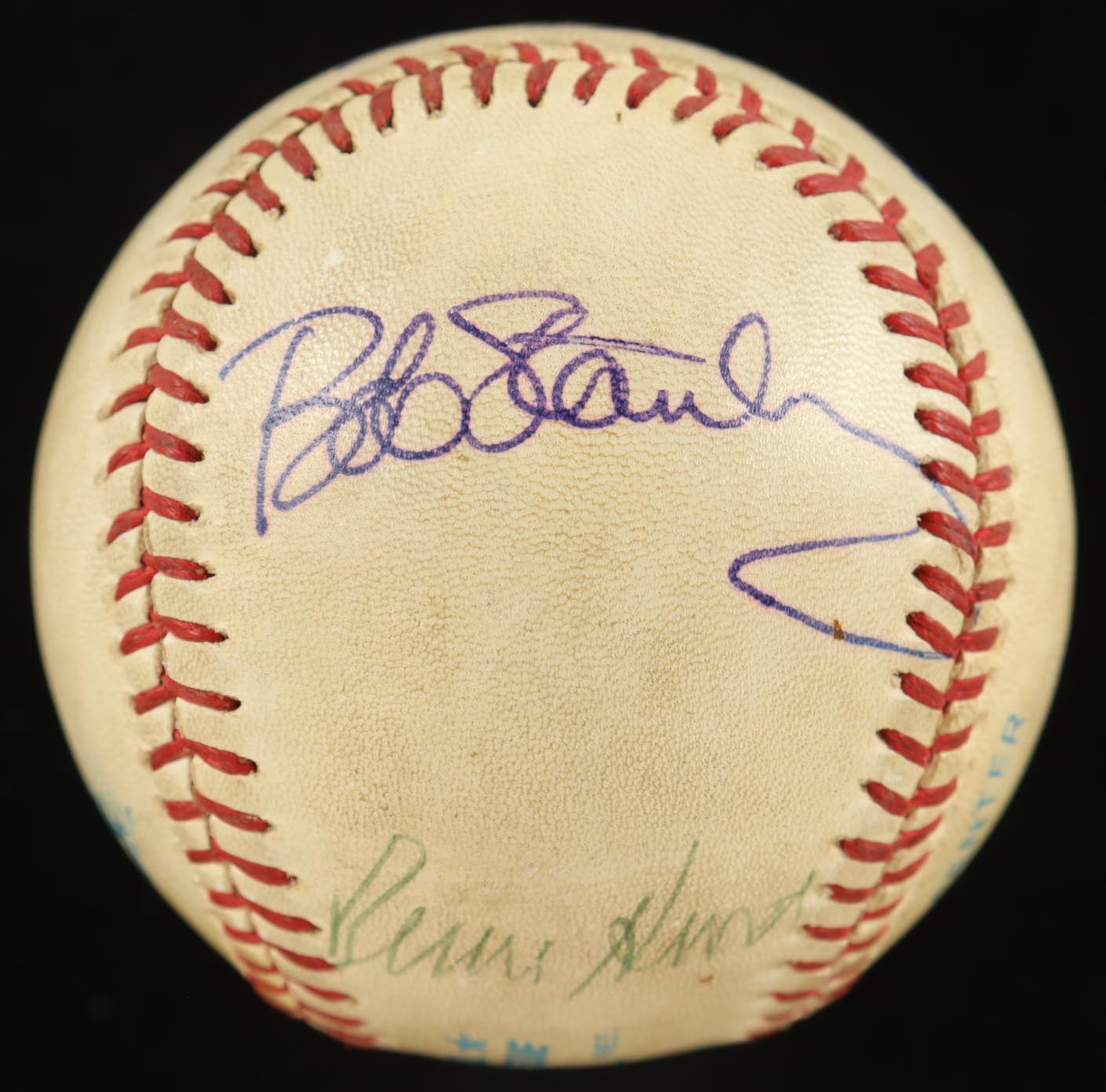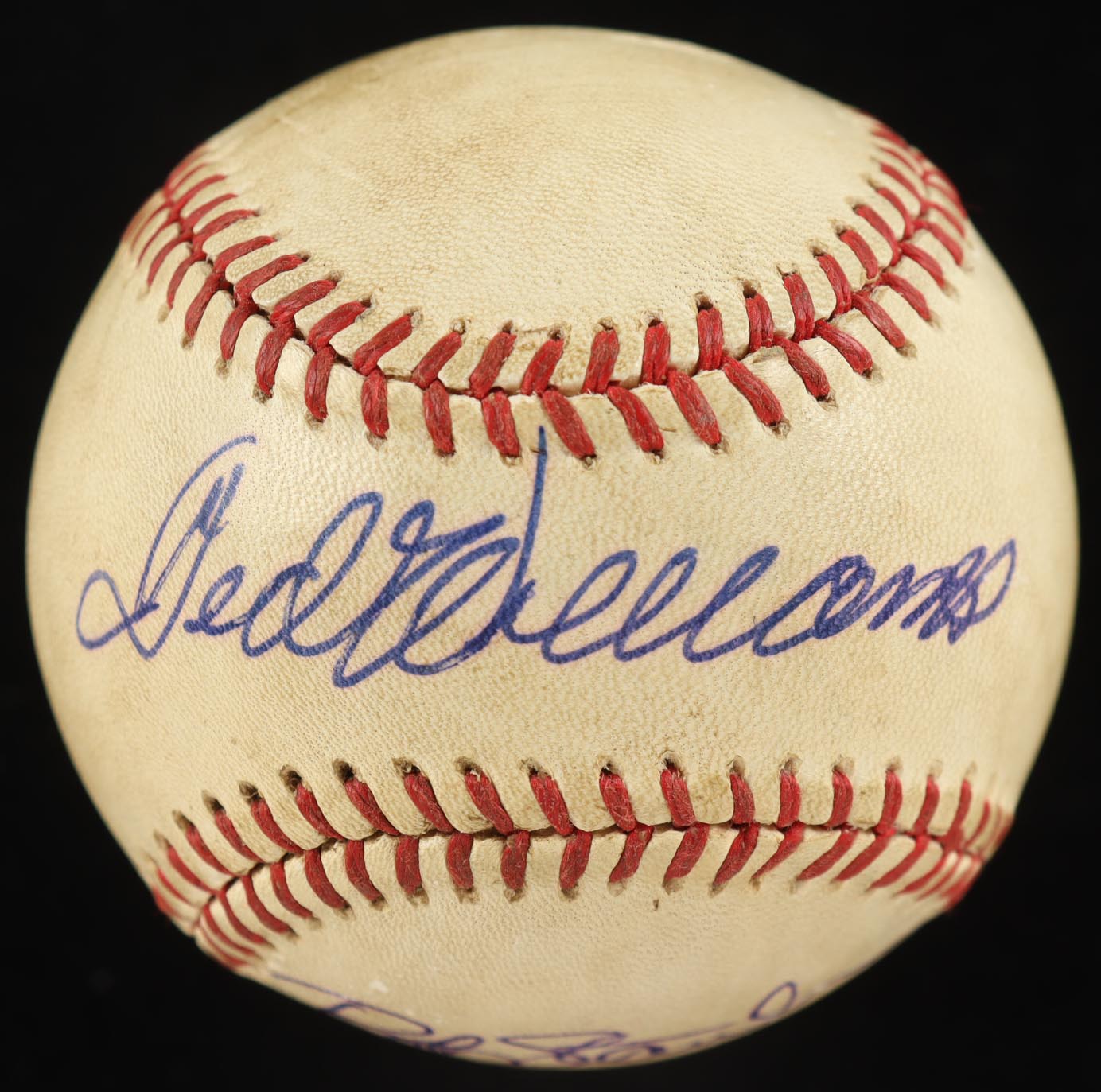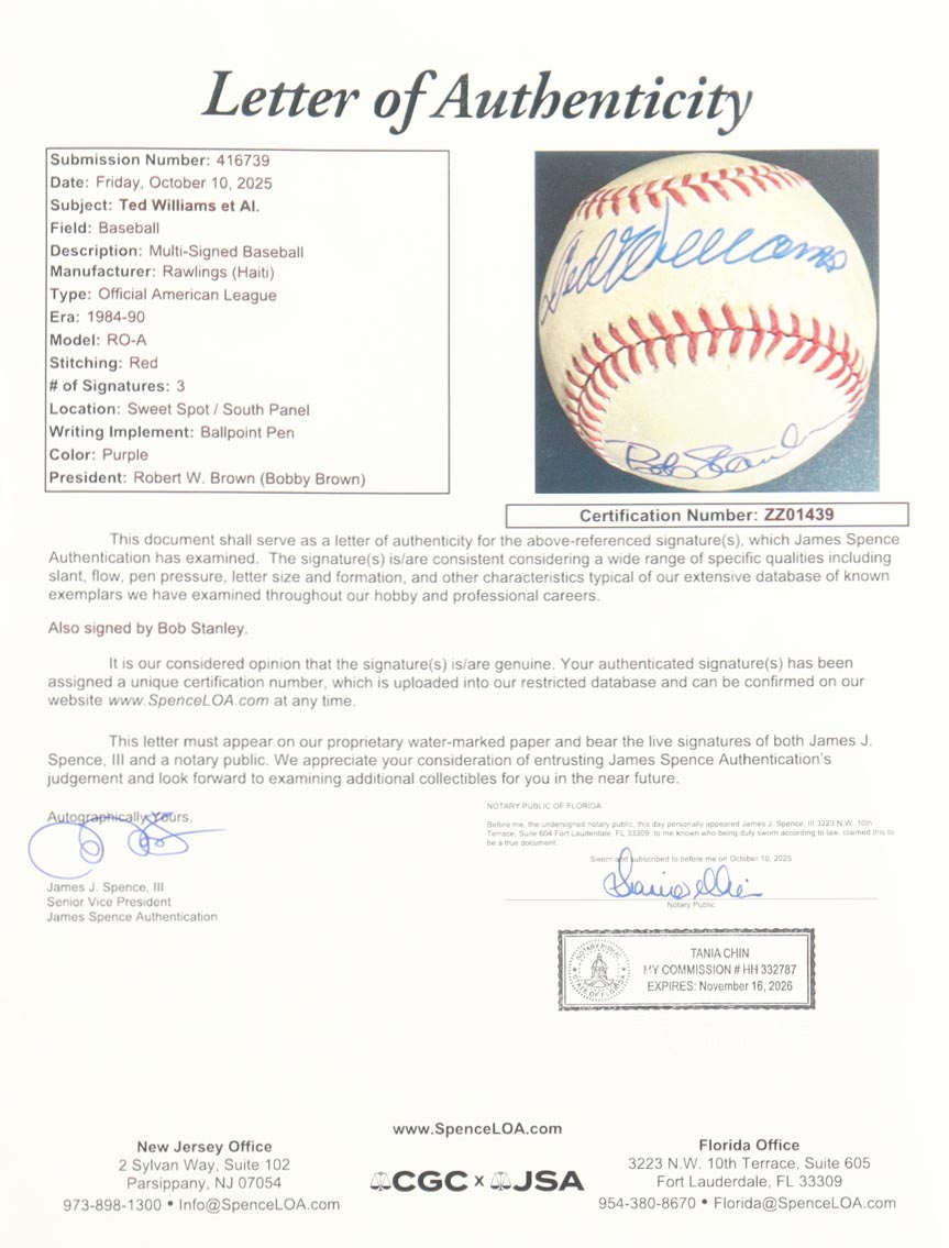 Custom frame measures 14” x 20” in size and features a photo as well as a Rawlings Official American League baseball that have been hand-signed by Ted Williams (D. 2002, Boston Red Sox, HOF). Baseball is also signed by (2) others including (Bob Stanley). Please note the ball is naturally toned and stained, see photos for more details on condition of item.