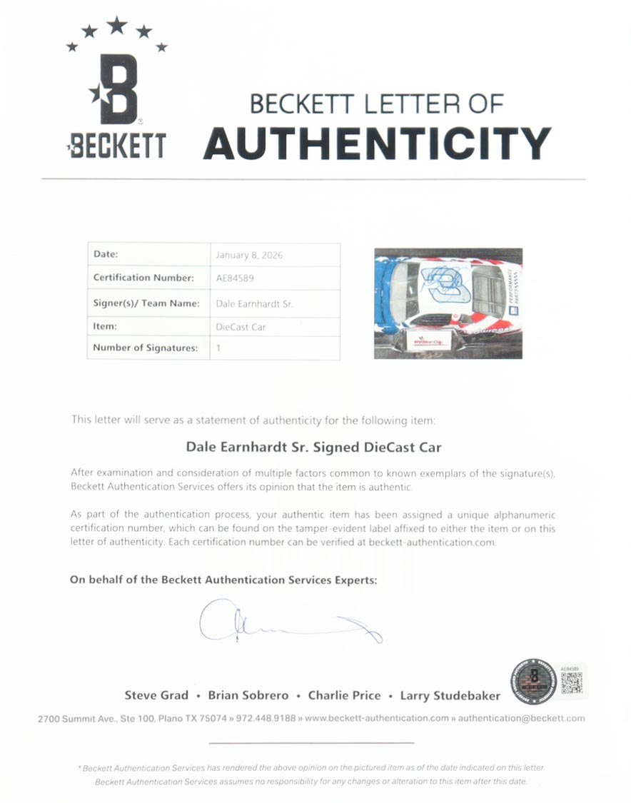 Die-cast car has been hand-signed on the roof by Dale Earnhardt Sr. (d. 2001, HOF).