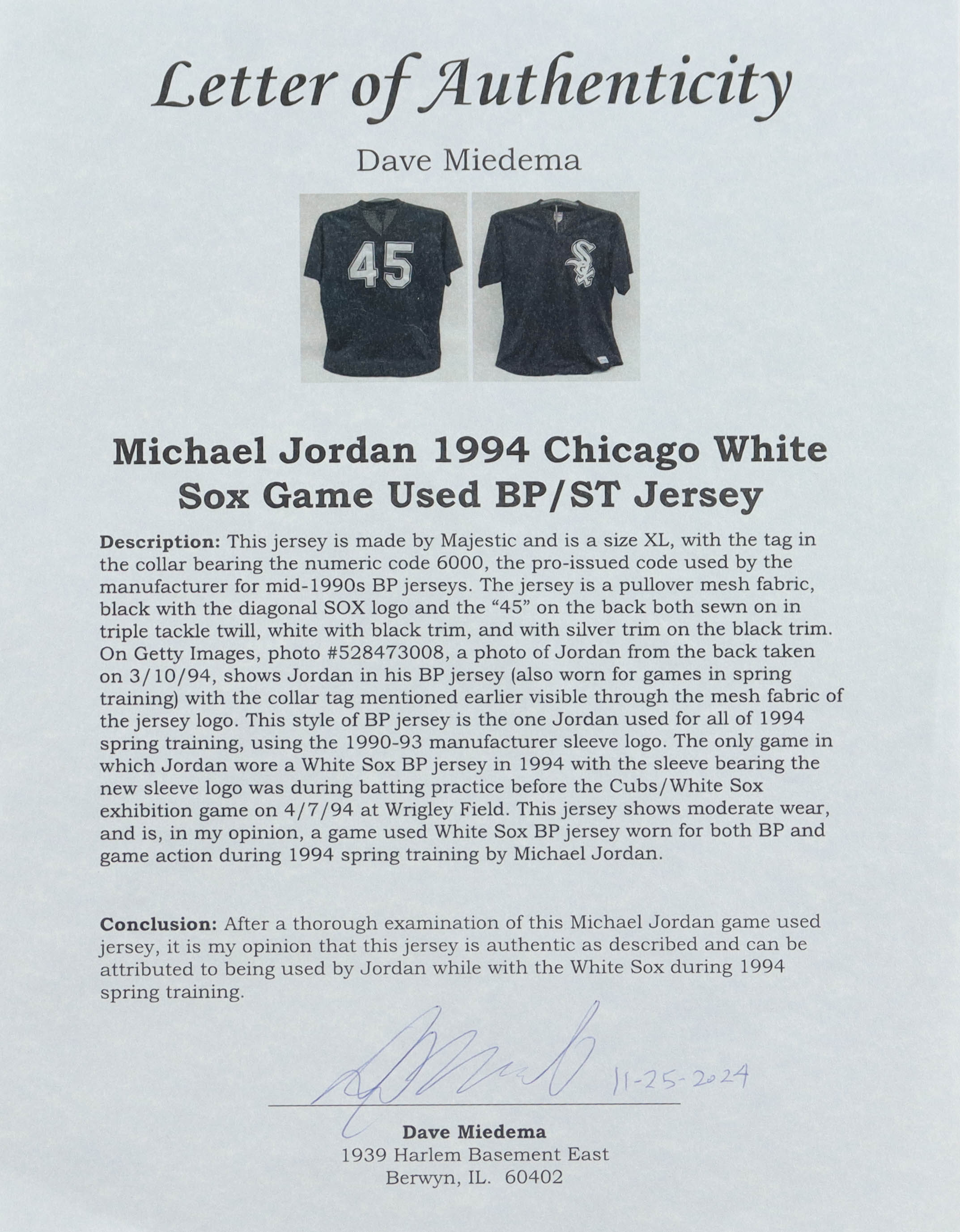 Majestic jersey, size XL. The jersey is game-used by Michael Jordan during the 1994 Spring Training season.