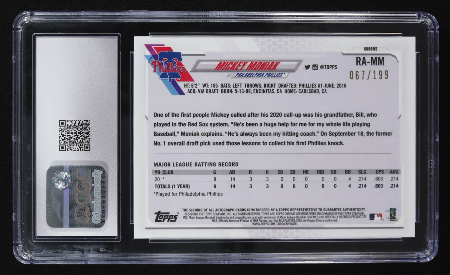 Mickey Moniak 2021 Topps Chrome Rookie Autographs Aqua Refractor #RA-MM RC #067/199 (CGC 9 | Autograph Graded CGC 10)